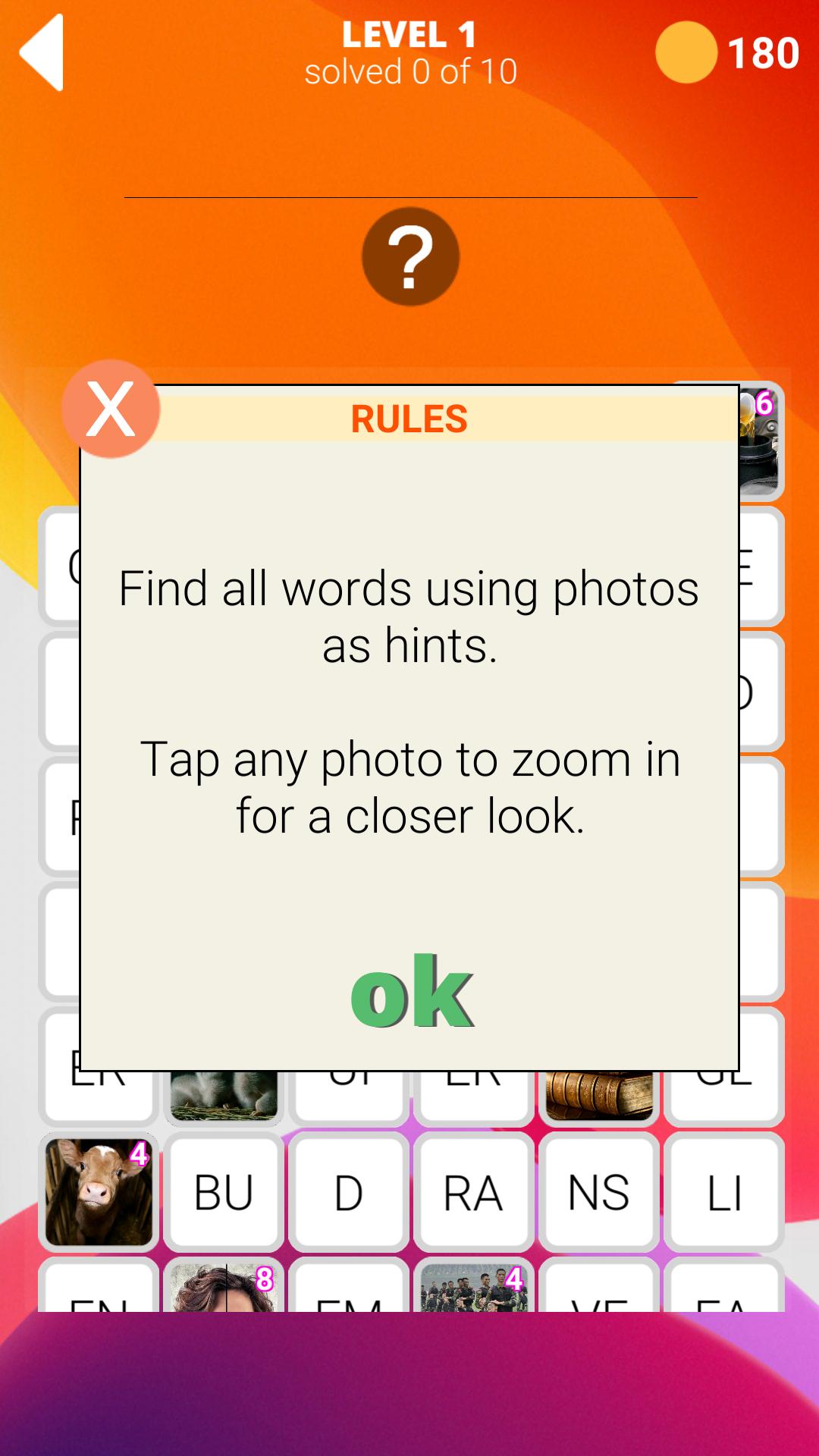 Guess the hidden word using the photo for the clue, the words are divided into fragments, the riddles are of different complexity, from easy words, which take seconds to solve complex words, which will take a lot of time to resolve.
