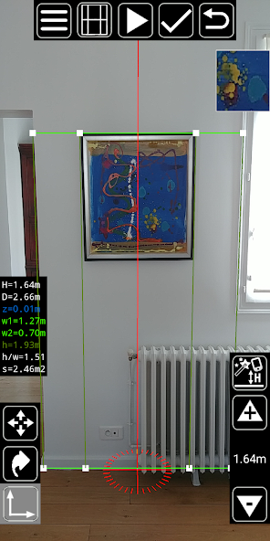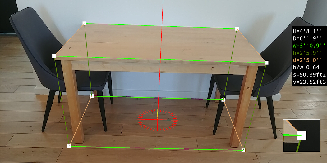 3D Measurement App / Plumb-bob is an augmented reality (AR) app which displays a virtual frame on top of the camera image. This frame remains vertical regardless of the orientation of your device. The frame dimensions are displayed in real time.