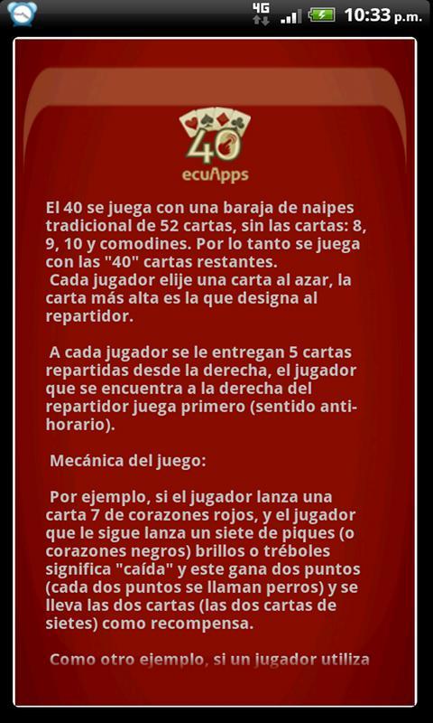 40 is played with a traditional 52 playing cards deck, without the 8, 9, 10, and jokers. Because of that, the game is played with the “40” remaining cards. The first player that earns 40 points wins the game.