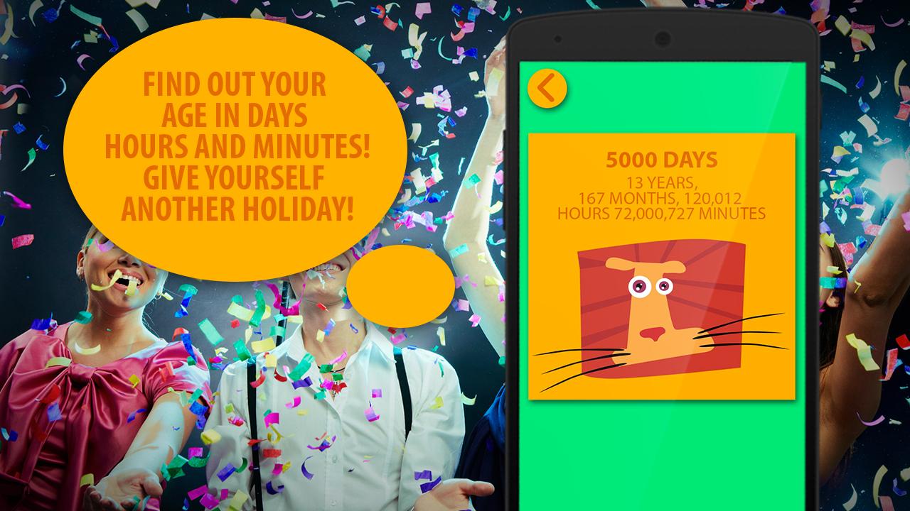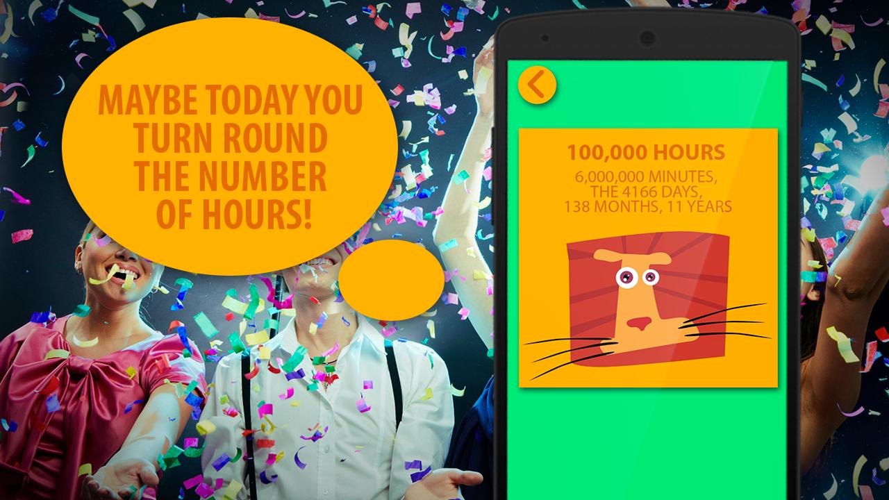 Mark your beautiful figure of past days or months! Maybe today you turned 5000 days! Requires parents gifts, and call your friends for a holiday! Or surprise your relatives, congratulated them with a round date! Suddenly grandma Today marks 20,000 days! Or 30000000 minutes!
