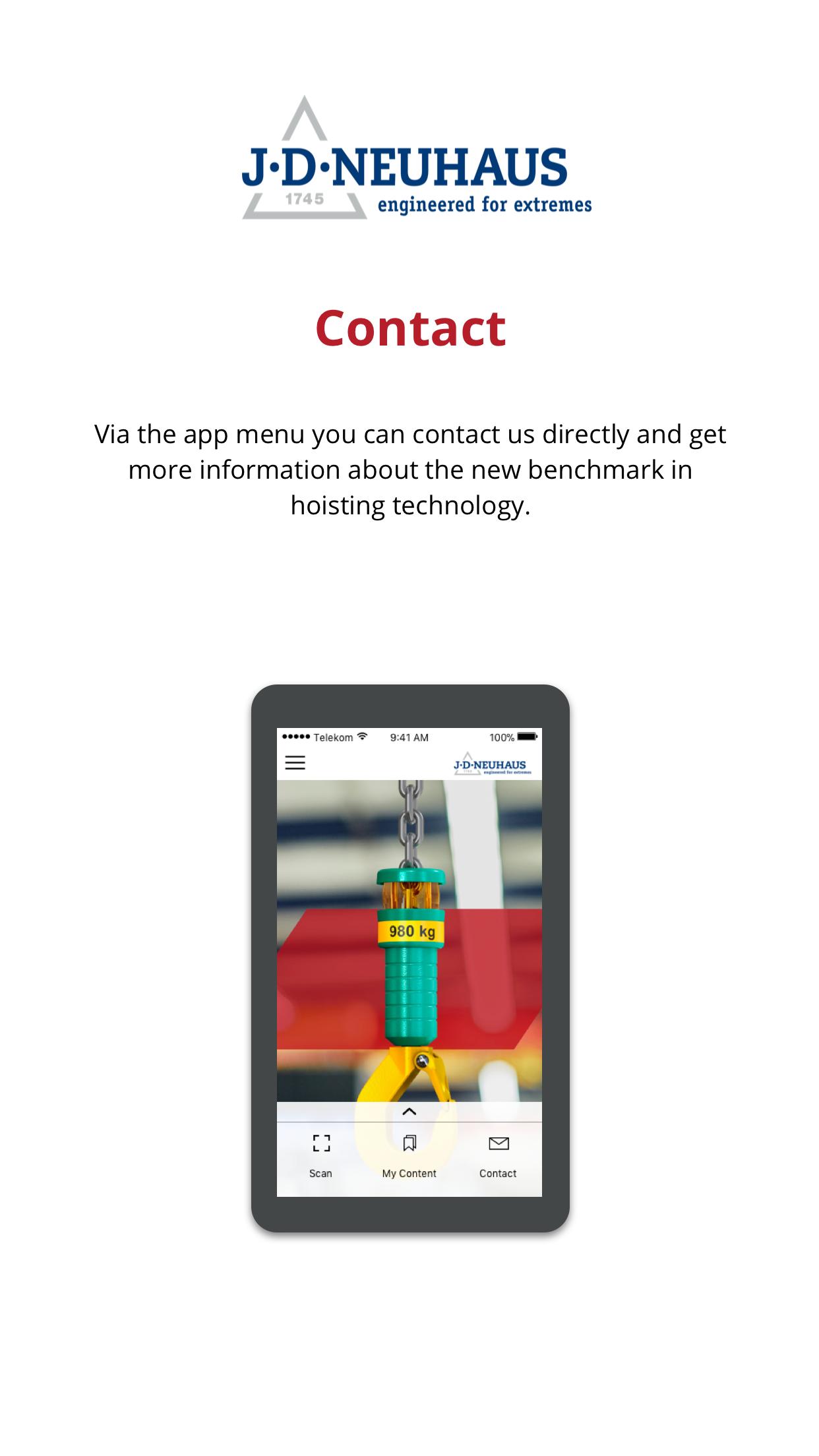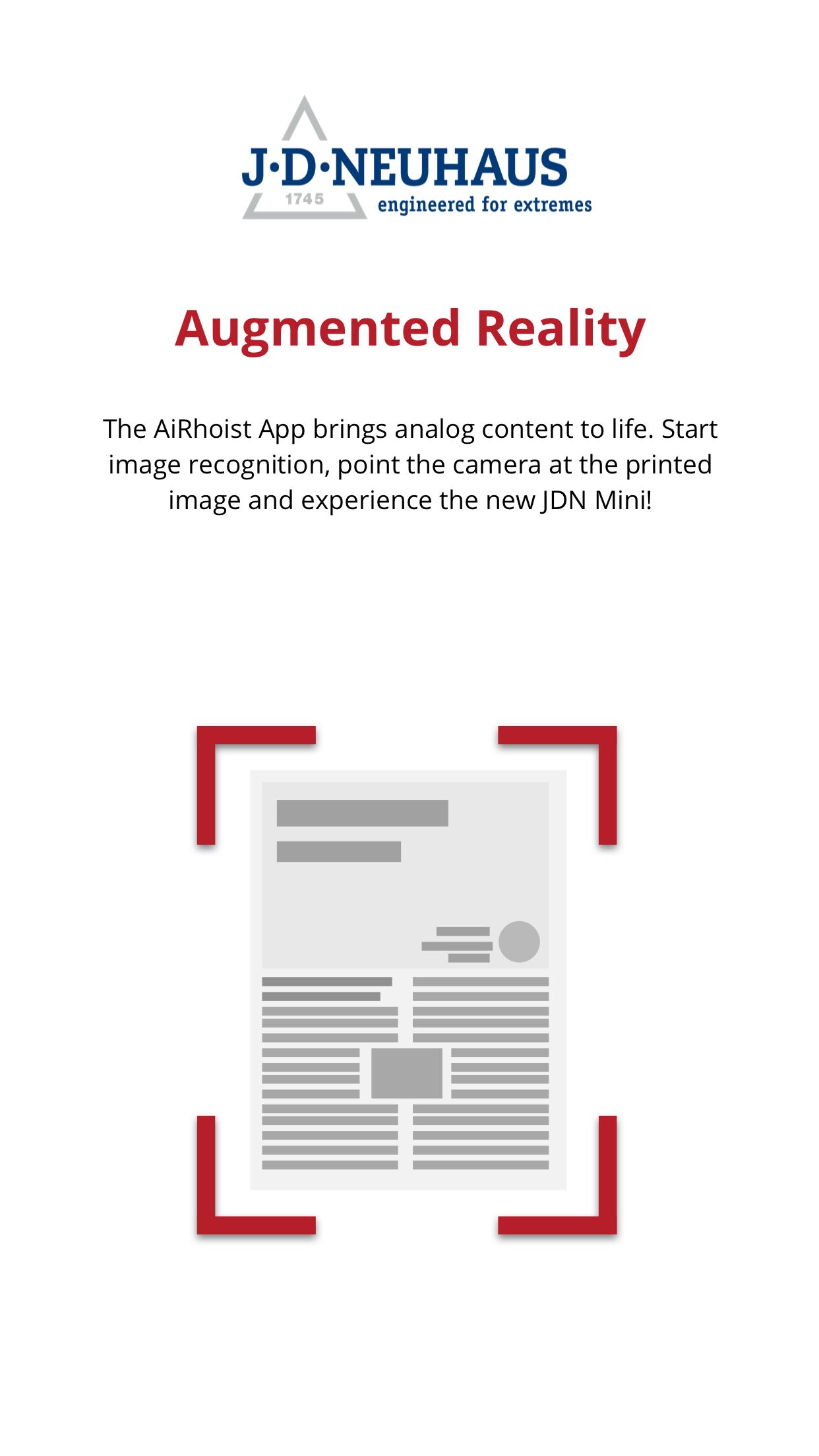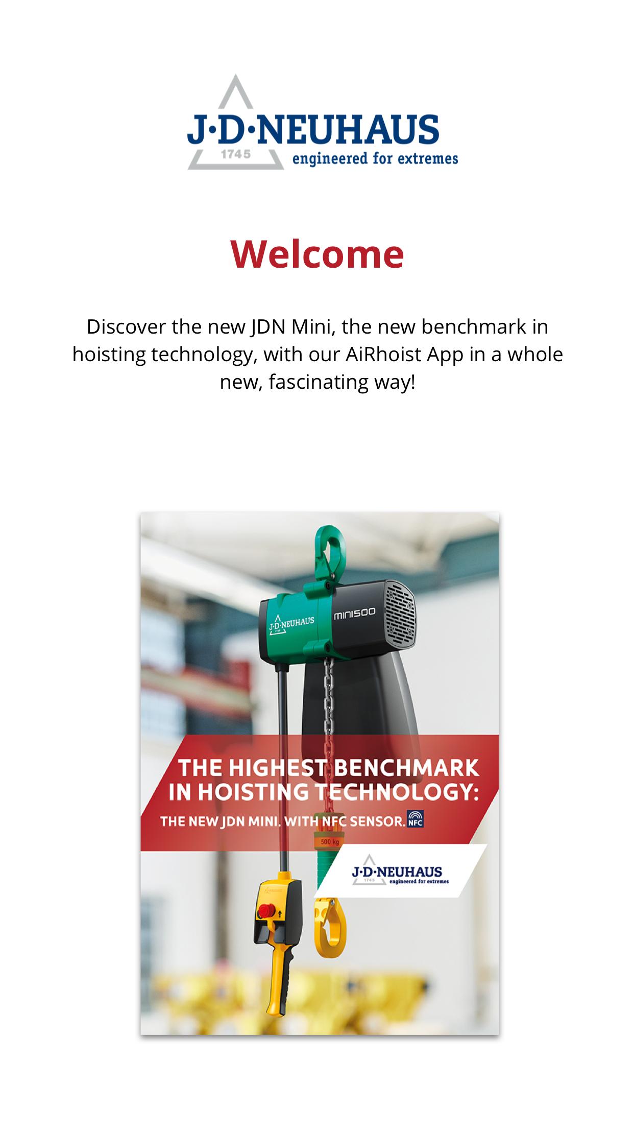 The new JDN Mini in Augmented Reality! With the AiR-hoist app from J. D. Neuhaus, the new JDN Mini will appear three-dimensional in your environment. This enables you to view the new benchmark in lifting technology from all sides in exact detail. The app also provides you with the most important technical information and other animated visualizations on your smartphone or tablet.