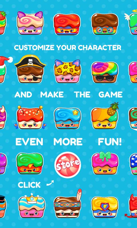 جمع الحلوى وزيارة متجر حلوى لتغيير مظهر كعكة عيد ميلادك: يمكنك اختيار جسم جديد أو أعلى أو زخرفة لذلك. يمكنك تخصيص تصميم الكعك لتحويلها إلى كعكة الشوكولاتة أو الفاكهة ، وكذلك إلى Angel ، Queen ، Princess ، Pirate ، Indian و Halloween Cake. يمكنك الحصول على مزيد من الحلوى بمساعدة حقيبة الحلوى أو جرة الحلوى أو صندوق الحلوى أو شاحنة الحلوى.
