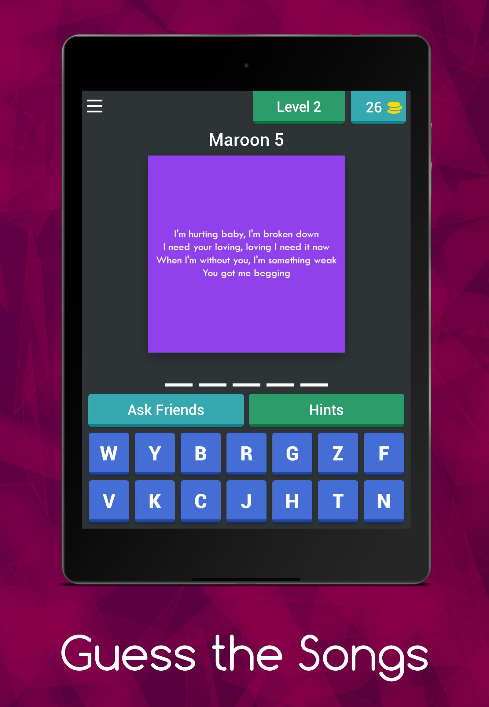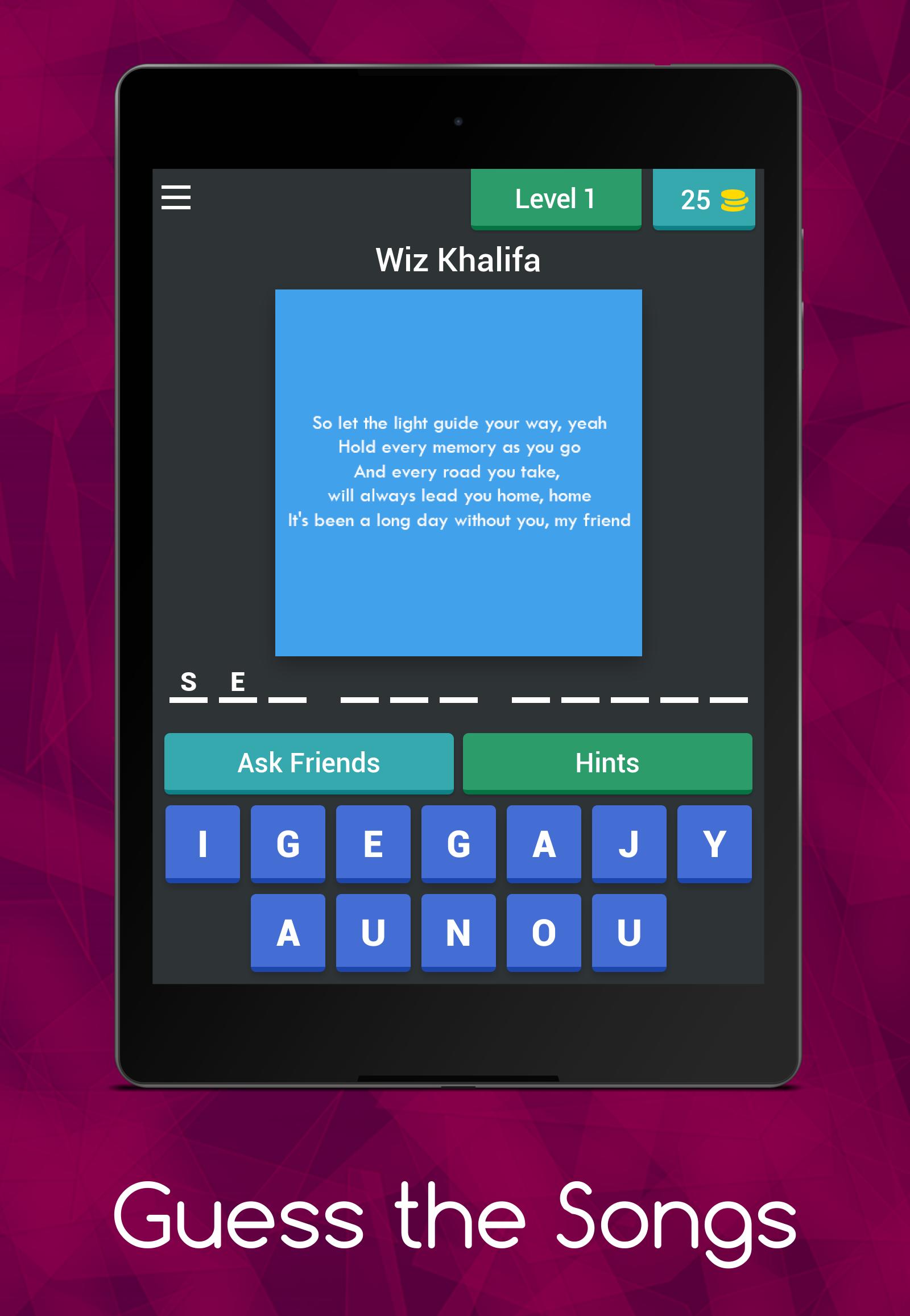 سيتم عرض كلمات أغنية معينة ومالك الأغنية ، عليك تخمين عنوان تلك الأغنية المحددة.
