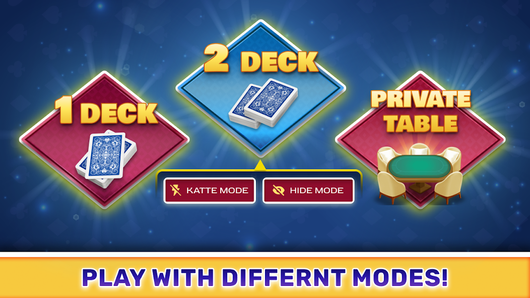 - إذا كنت تلعب "وضع Katte" ، فإن جميع اللاعبين لديهم نفس القوة لإعلان ترامب. يمكن للاعب الذي ينفد بطاقة أي دعوى ، والتي تلعبها الآن ، أن يعلن ترامب.