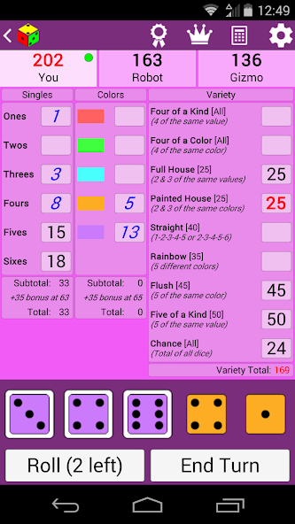 الهدف من ذلك هو تسجيل نقاط عن طريق تدحرج النرد لإجراء مجموعات معينة. خلال كل منعطف ، يُسمح لك بتدوير النرد إلى 3 مرات ويمكنك اختيار النرد للاحتفاظ به قبل إعادة توليد الآخرين. بعد القوائم الثلاثة (أو أقل إذا قررت التوقف) ، يجب عليك اختيار فئة على بطاقة الأداء الخاصة بك لتعيين النقاط. لا يمكن استخدام كل فئة إلا مرة واحدة. يتناوب اللاعبون على القيام بذلك حتى يتم استخدام جميع فئات الدرجات ، ثم أي من لديه أعلى الدرجات يفوز. يتم تضمين المزيد من التعليمات التفصيلية في التطبيق.