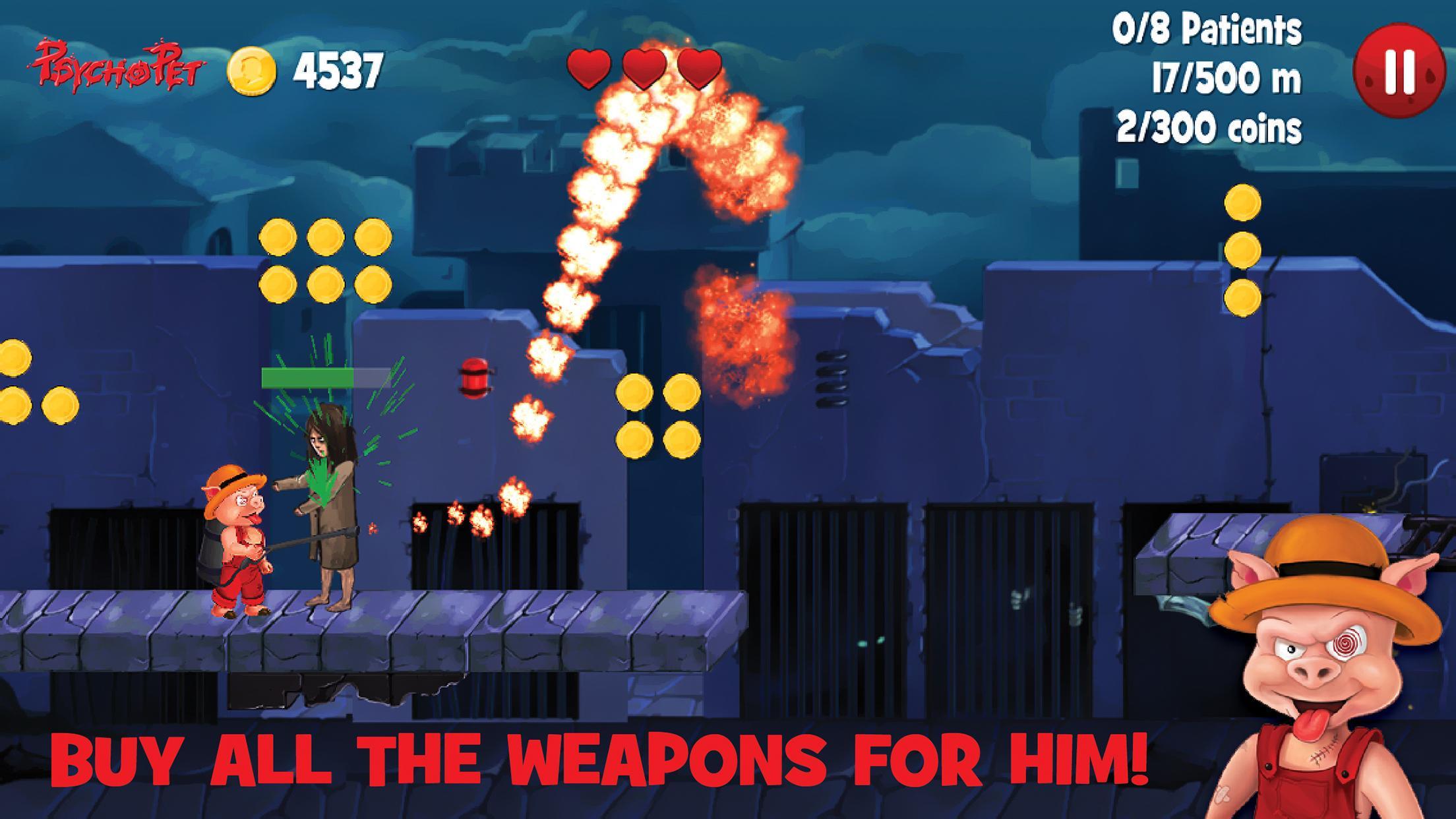 يمكنك بدء اللعبة مع Burny Piglet ، واحدة من الأحرف الثلاثة. إنه مغلق في السجن ، وهو يشبه مستشفى للأمراض العقلية ، وسوف تقاتل من خلال 9 مستويات: الأطباء والممرضات والمرضى والعناكب تجعل مهامك صعبة للغاية ... إذا خرجت من هذا الكابوس ثم يأتي المقبرة والمعبد! لكن كن مستعدًا: لإنهاء المستويات التي يجب عليك التغلب عليها في جميع التحديات ، مثل قتل الأعداء ، وجمع العملات المعدنية أو تشغيل مسافة معينة! هل يمكنك فعل ذلك إذا كان لديك 3 أرواح فقط؟