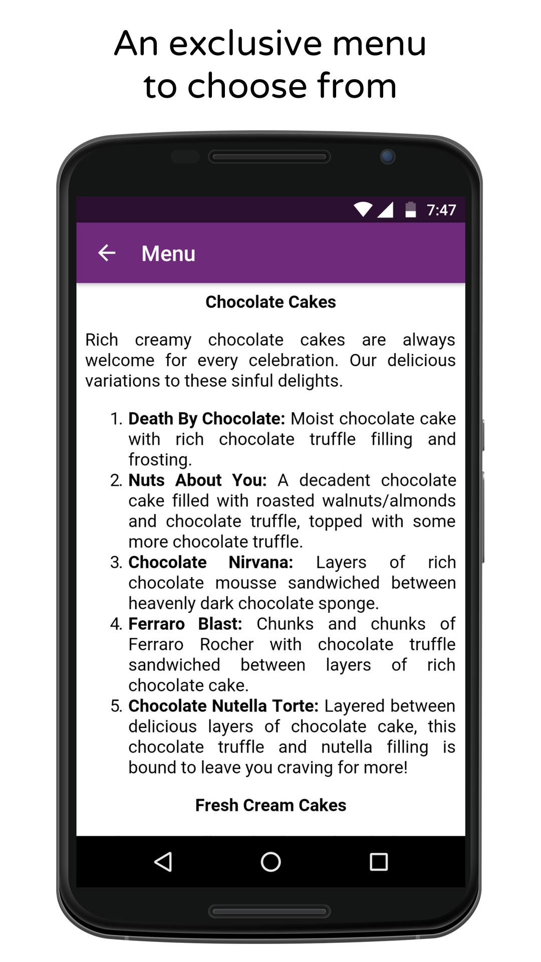 تصفح من خلال فئات umpteen من الكعك المشبع والكلاسيكي. شارك مفضلاتك مع أصدقائك وقراءة المزيد عنا من خلال شهاداتنا. اتصل بنا من خلال التطبيق وسنكون سعداء لخدمتك بأرقى الكعك الطازج الذيل بنسبة 100 ٪.