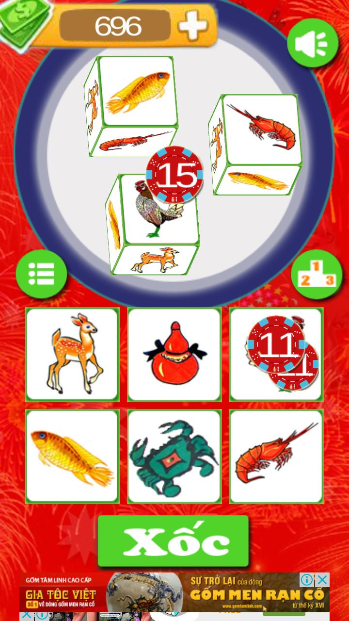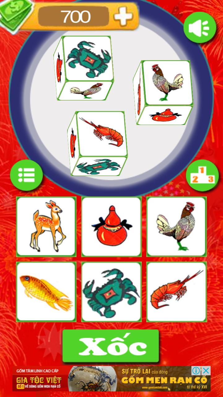 The way to play crab is very simple: With the same way of playing the game xoc dia, players choose one of the 6 lucky mascots is Bau, Cua, Tom, Ca, Ga, Huou, then shock and bet with many different betting levels. Players win if the diamond is exactly the same as the dice.