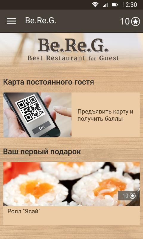 Present a bonus card at every visit to the restaurant and get points! For accumulated points, you can get pleasant gifts! You can receive your first gift immediately after installing the application.