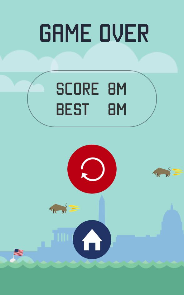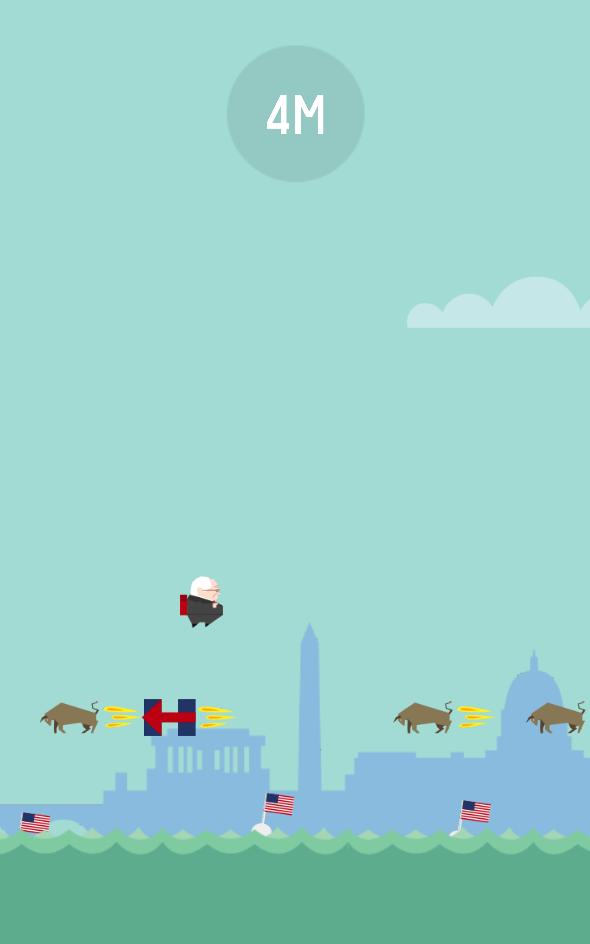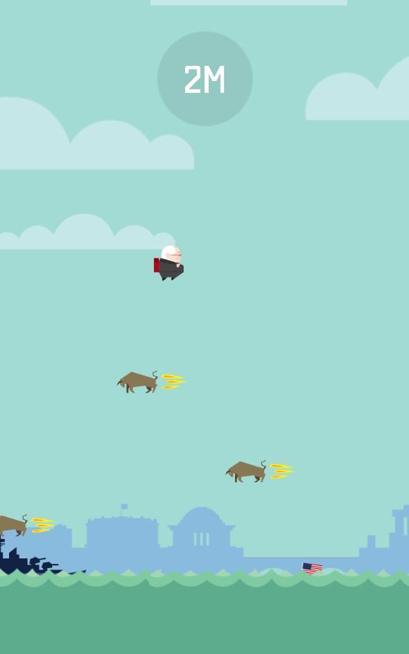 Bernie knows what this world needs. A tough, confident and no-nonsense leader to guide us away from the shameful red shades of the past. The U.S.S. Sanders floats in support while the capital flies past in the background. He must overcome flying bulls, distracting competitors and the bourgeois while focusing on the prize: Helping the best people in the world!