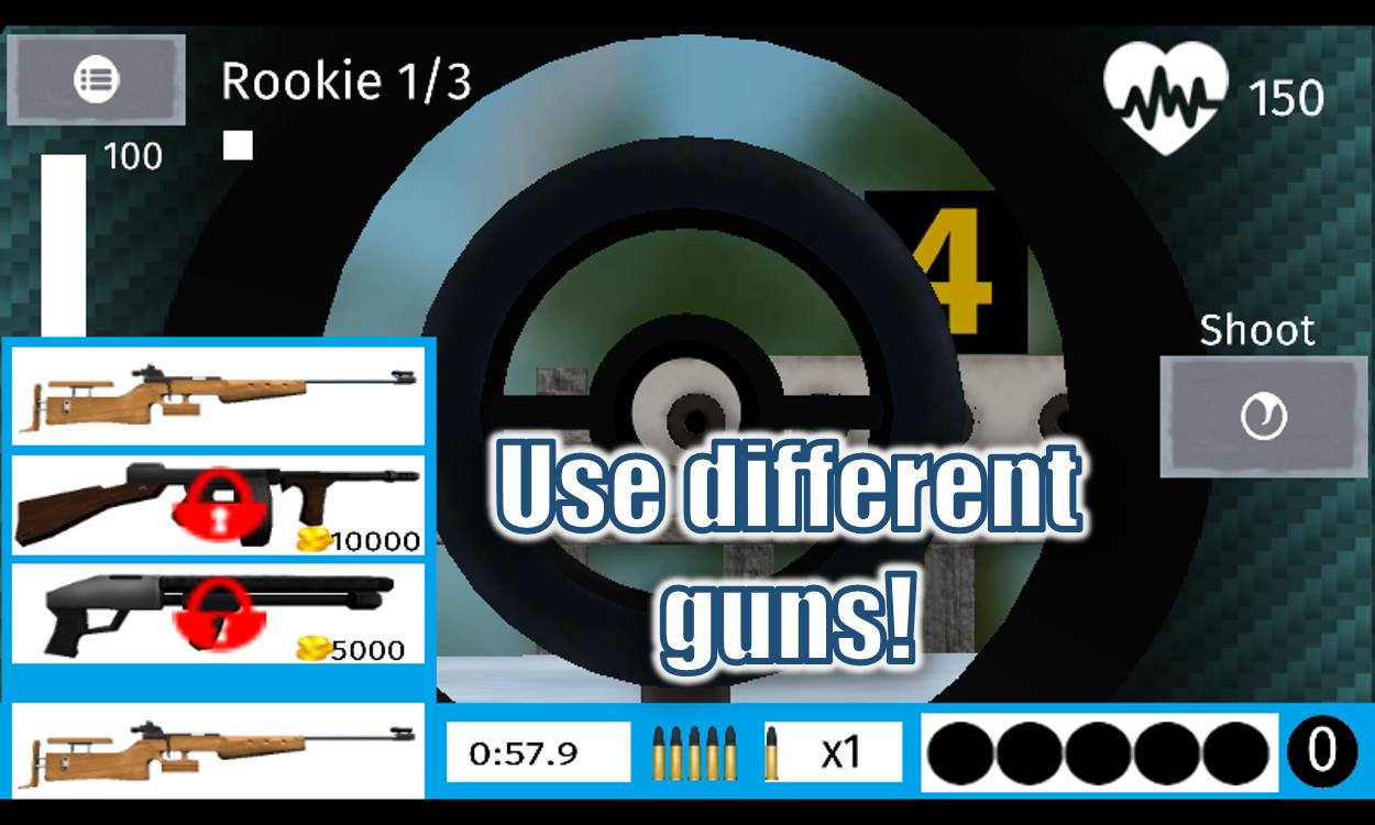 Shoot with realistic biathlon rifle and targets. Use your coins to buy machine gun and shotgun. These with your selected strategy will help you to complete levels