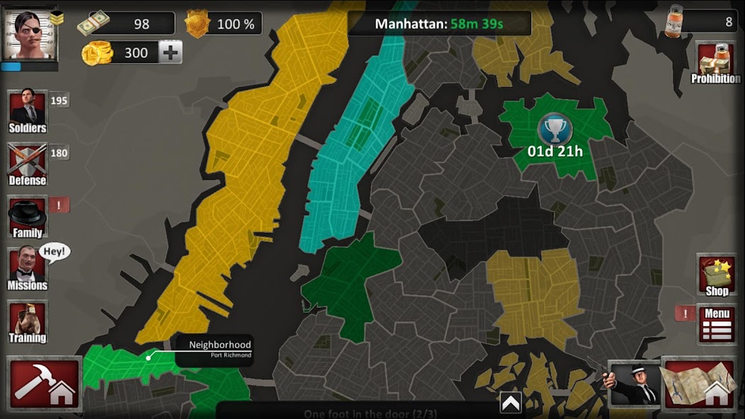 • Fight against other mafia families. Conquer their territory and advance your influence level with it.
