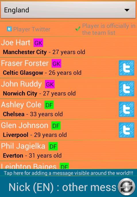 It shows the current squad of each team, updated when the official lists will be published. For each team it shows info about the players, with a new feature, you will be able to see the players timelines in Twitter! without needing to leave the app.