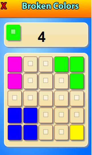 Broken Colors is a board game where the player has to lay 25 colors on the plate. Every turn the player must place one color on the plate. Each color must be connected to each other until the plate is full. Red on red and blue on blue. If a color is not connected (broken), the player will receive penalty points!