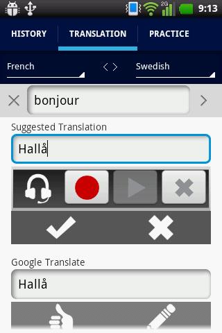 Behind the application is a database of translations approved by native speakers. When a phrase is translated, the app will search the database for an approved translation. If the phrase is not in the database the app will use Google to translate the phrase. After translation the user can review the translation, either voting it as correct/incorrect, or submit a new translation to the database.