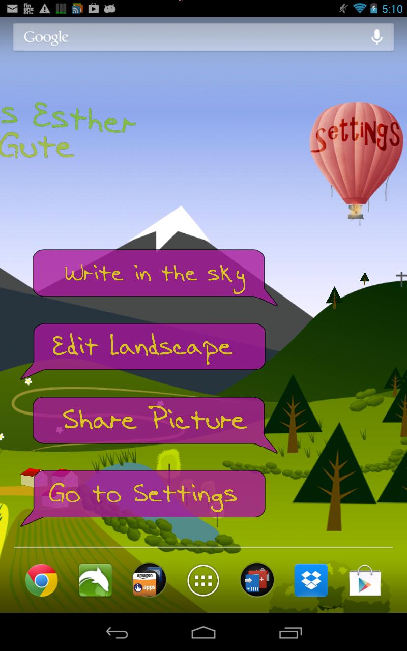 Use the outstanding Live Wallpaper Generator edit mode to create the cartoon toy landscape you are dreaming of. Enjoy the swaying trees, houses, shrub and the moving balloons. If you like, write your own personal message into the sky. And send it to your friends as an (animated) postcard. And, it is not always sunshine: You can let it rain or switch between sunrise, sunset and twinkling stars at night. Plenty of configuration options waiting for you, all in the pro versions of this app.