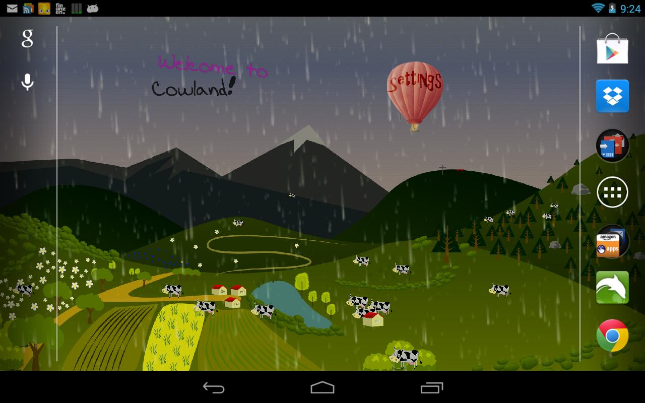 Cartoon Live Wallpaper: Have a rest and enjoy your free time by watching this cow land cartoon village with green hills, flowers, mountains and more. You will discover a place for meditation in everyday trouble. The peaceable comic cows are examples of slow and worthwhile life in peace.