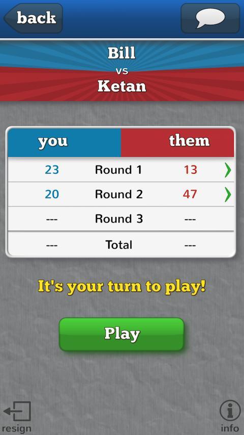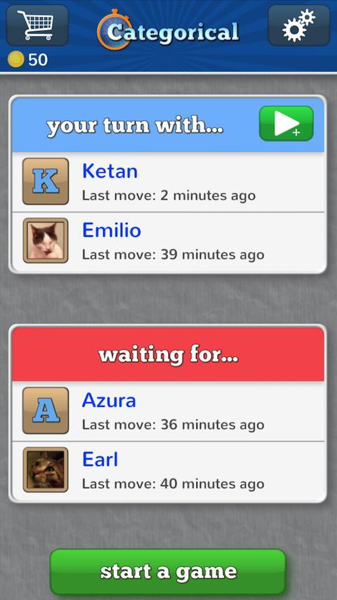 With Facebook integration, you can find your friends and start games quickly! Or you can skip Facebook if you'd rather use Categorical on its own. Send messages back and forth, start games against random players if you want, and start challenging your brain with Categorical! It's got the category fun of Scattergories and the social gameplay of Words with Friends!