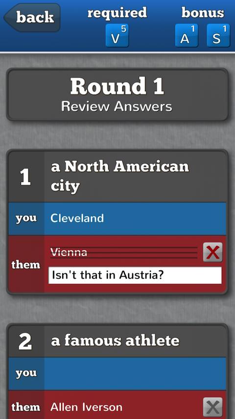 Quick, name a city with a "V" and an "E" in its name! Can you think of something expensive with an "R" and a "C"? From the creators of aTilt 3D Labyrinth, Categorical is the social word game that challenges you to score big points by using the right letters to come up with answers to a list of categories! Play against your friends to see who can come up with the best answers. Is your opponent making an answer up? Challenge them and find out! Categorical is turn-based, so you can play at your own pace.