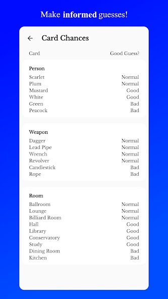 Card Chances - Card Chances is a game-changing functionality that employs advanced algorithms to calculate the probabilities of each card being held by different players. Armed with this information, you can make smarter guesses and increase your chances of solving the mystery. Let our app do the number crunching, while you focus on cracking the case!