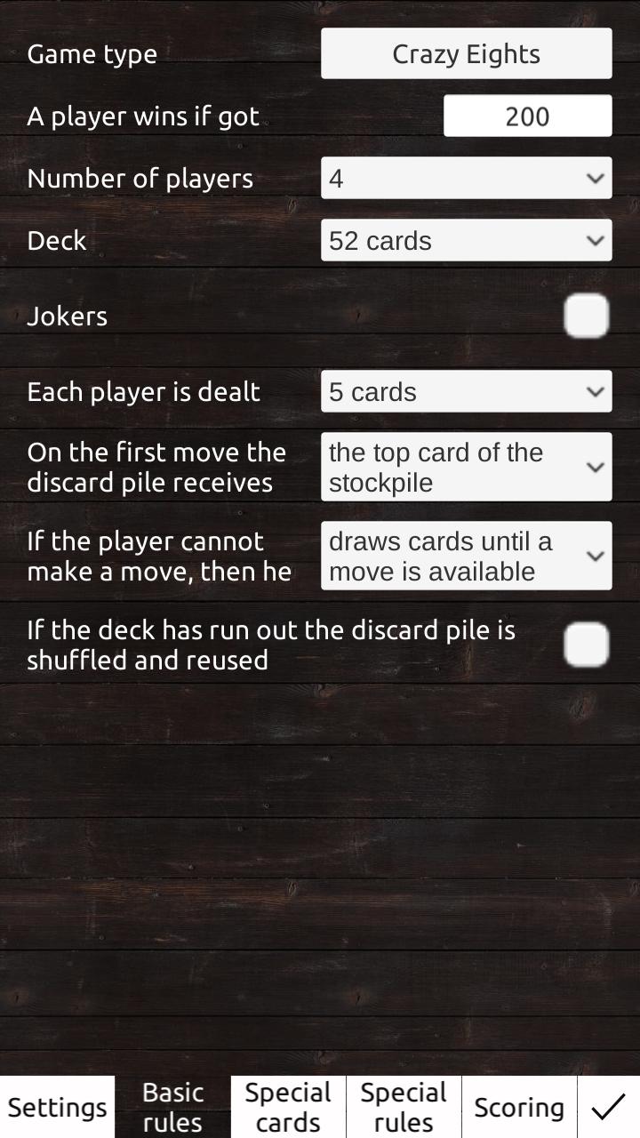 Crazy Eights is a shedding-type card game for two to seven players. The object of the game is to be the first to get rid of all the player's cards to a discard pile. There are many variations of the basic game, and a number of different names including Craits, Last One, Mau-Mau, Pesten, Rockaway, Swedish Rummy, Switch, Last Card, Screw Your Neighbour, Püskiyon, and Tschausepp. You can play most of these games.