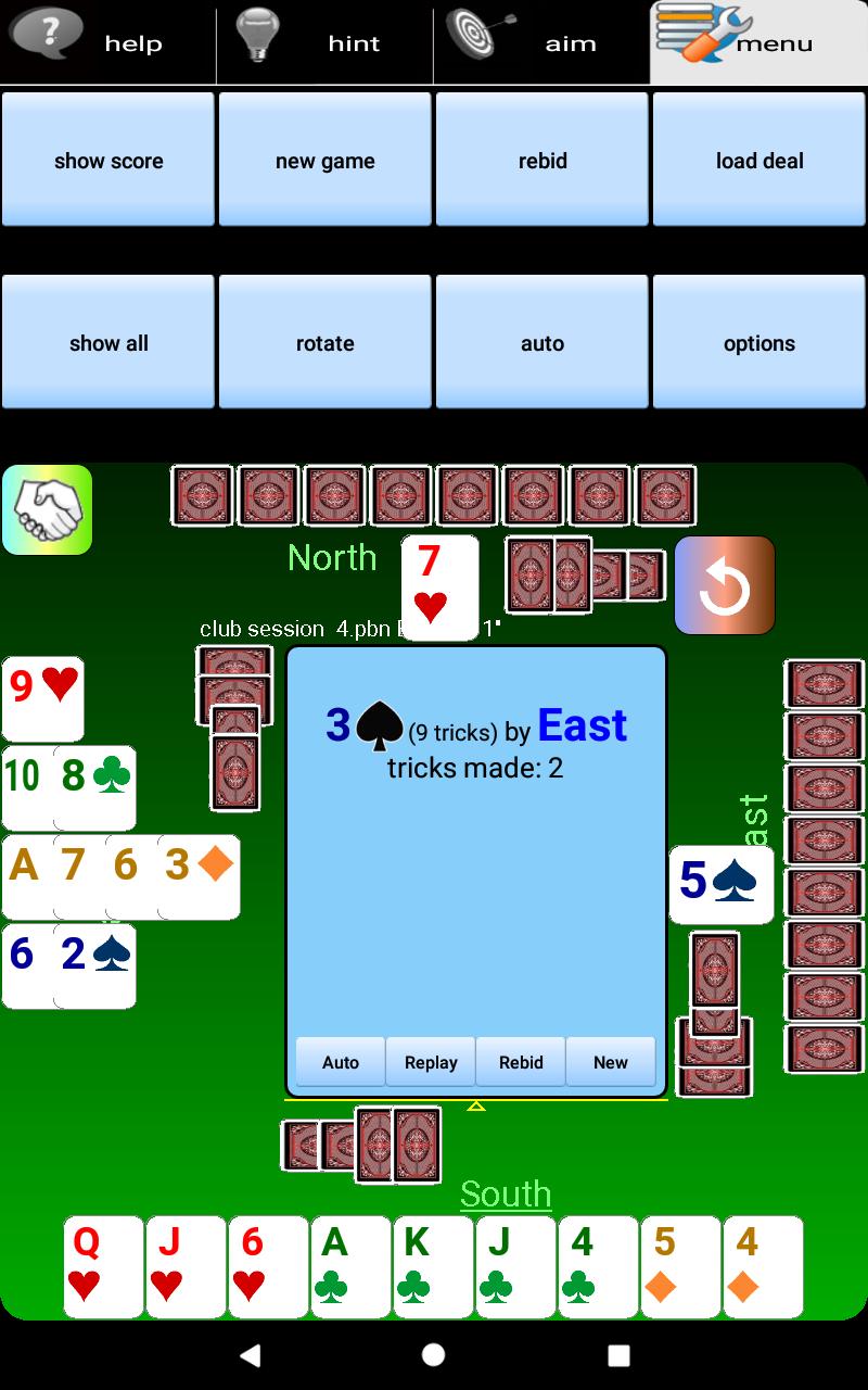 [Sie können auch Angebote und Ergebnisse Ihres örtlichen Bridge Club herunterladen. Option "Laden" verwenden; dann "Web -Search, um Angebote zu finden"; Finden Sie Ihre Club -Website; Gehen Sie zu Ihrer Ergebnisseite; Berühren Sie die Registerkarte "Hände" und berühren Sie "Download als PBN"].
