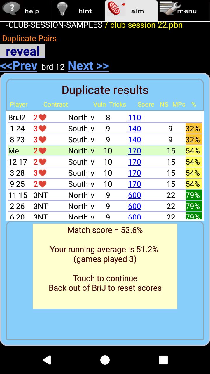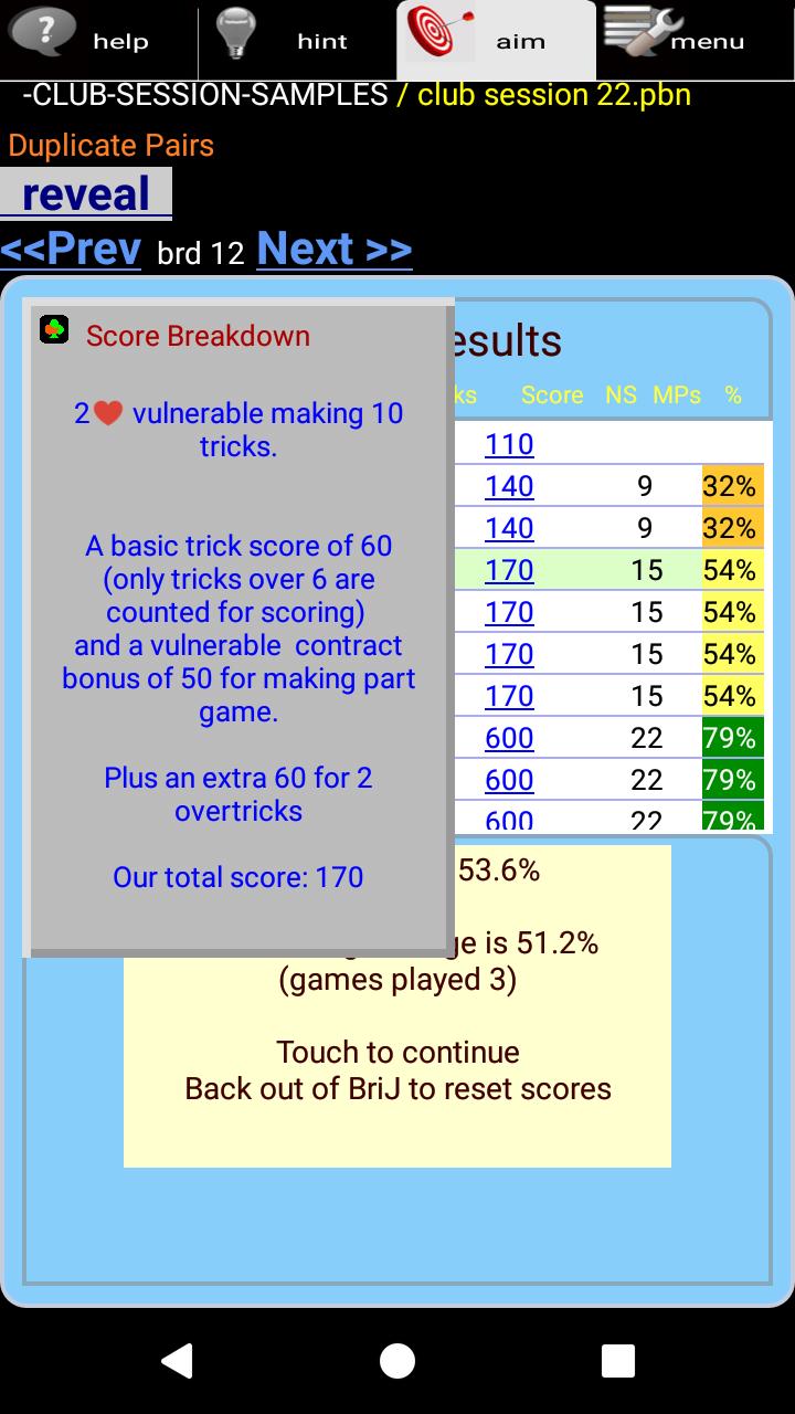Wenn Sie eine Hand gespielt haben, sehen Sie eine doppelte Punktzahl, die wettbewerbsfähige Ergebnisse anderer Spieler zeigt. Brij wird einen laufenden Durchschnitt haben, damit Sie Ihren Fortschritt bewerten können. Wenn Sie eine Clubsitzung laden, wird Ihr Ergebnis mit dem aus den Ergebnissen der echten Spieler verglichen.
