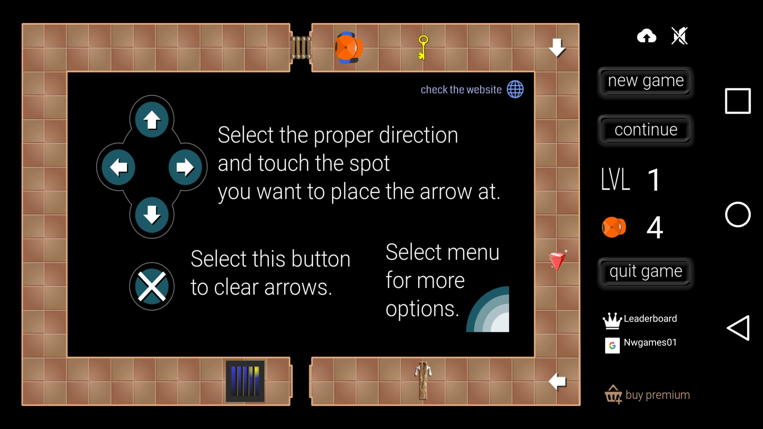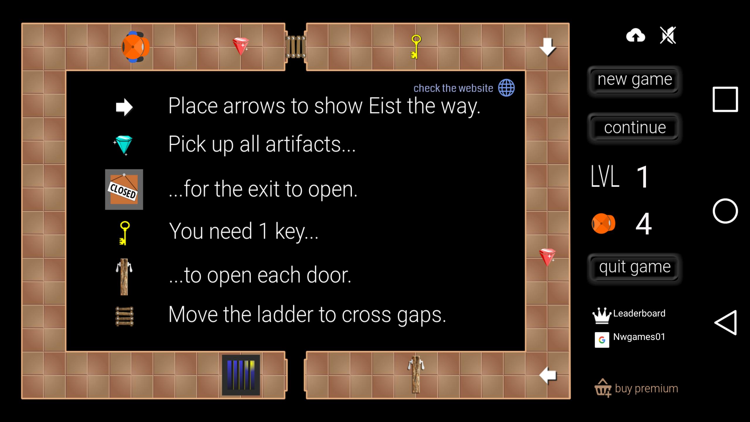 Tragen Sie EIST durch die Bretter und platzieren Sie Pfeile auf dem Weg, um die Richtung anzuzeigen. Abstieg vom Weg lässt ihn fallen. Sie müssen alle Artefakte abholen, damit der Ausgang geöffnet werden kann. Unterwegs treffen Sie Türen: Sie benötigen einen Schlüssel, um jeden zu öffnen. Verwenden Sie die Leiter, um Lücken im Pfad zu überqueren. Es kann nur an ausgewiesenen Stellen festgelegt werden. Berühren Sie die Leiter, um sie aufzuheben und dorthin zu setzen, wo Sie benötigen. In einigen Boards treffen Sie auch Teleports: Sie bewegen sich ineinander. Denken Sie daran: Die Bewegungsrichtung bleibt gleich.
