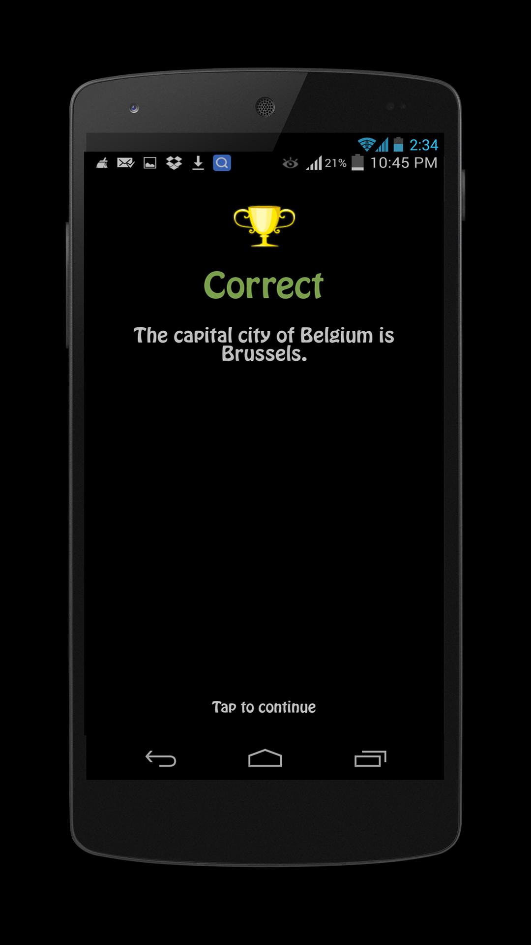 Im Mehrspielermodus können Sie mit Ihren Freunden und Ihrer Familie auf demselben Gerät Duelle spielen und sie mit Ihrem herausragenden Wissen überraschen. Teilen Sie Ihre Ergebnisse mit anderen, indem Sie sie auf Facebook und Google Plus teilen.