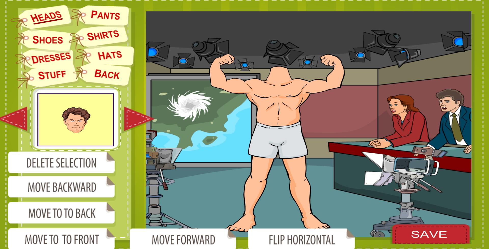 Dress the dork by selecting items and then clicking and dragging them into the body. You can resize items with finger by dragging over the corners of the item when it is selected. Use buttons to change items depth.