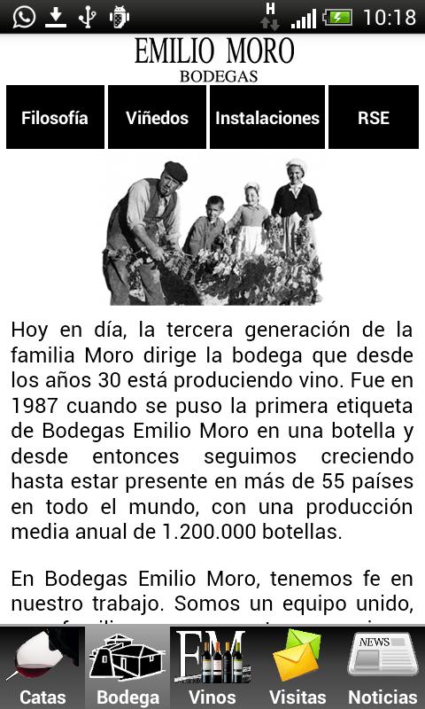 Application that allows you to learn the secrets about the world of wine from the hand of one of the wineries reference in the Ribera del Duero: Emilio Moro Winery. In addition, you can create a history of the tastings of wines each and include photos of them. It also displays information about us and our wines: Villa Resalso, Emilio Moro, Malleolus, Malleolus of Valderramiro, Malleolus of Sanchomartín and Emilio Moro Clone Family.