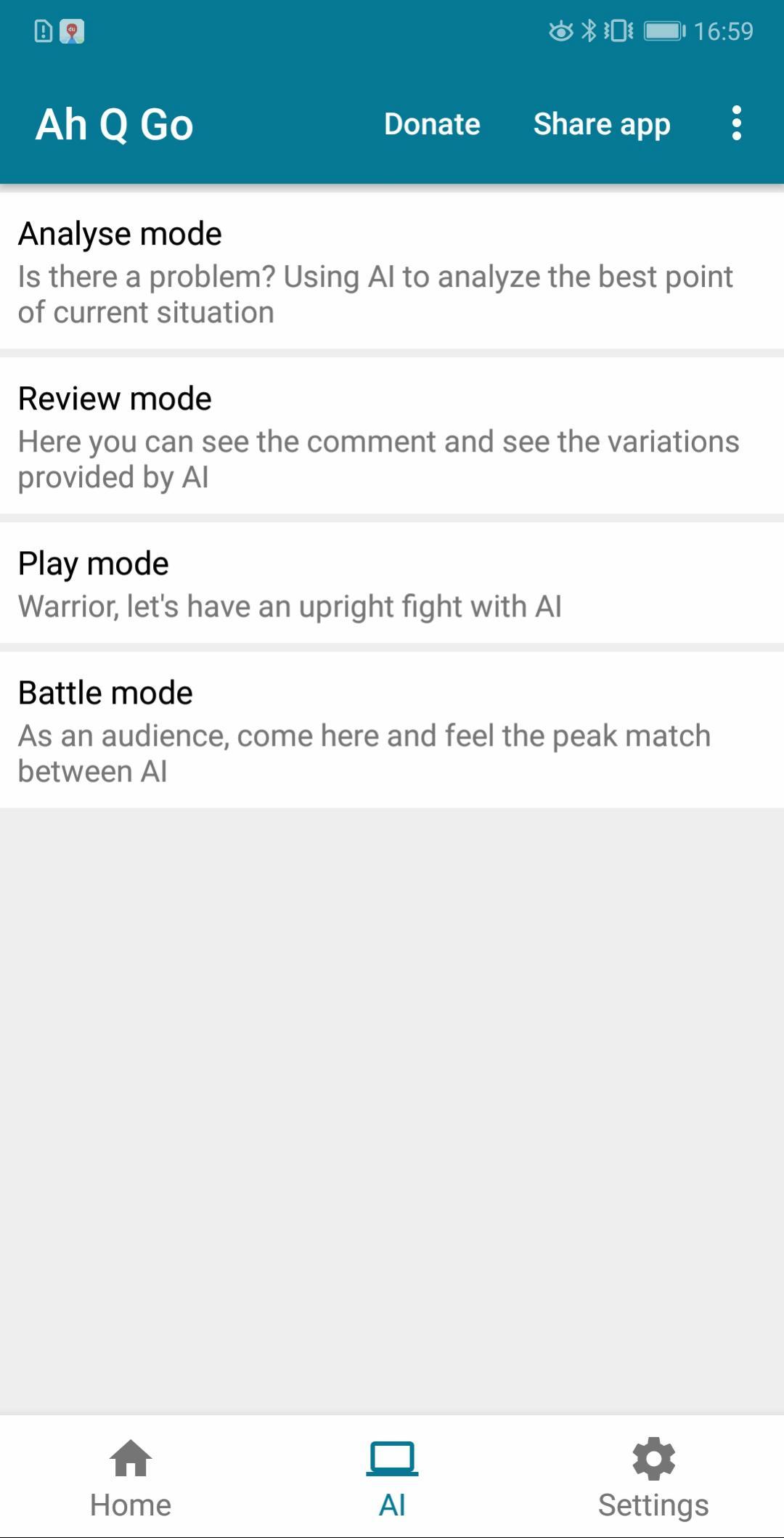 Ah Q Go (AhQ Go/AhQGo/AQ Go/AQGo) integra 4 motores Go, incluidos LeelaZero, AQ, Ray, Pachi, que tienen diferentes niveles de dificultad.