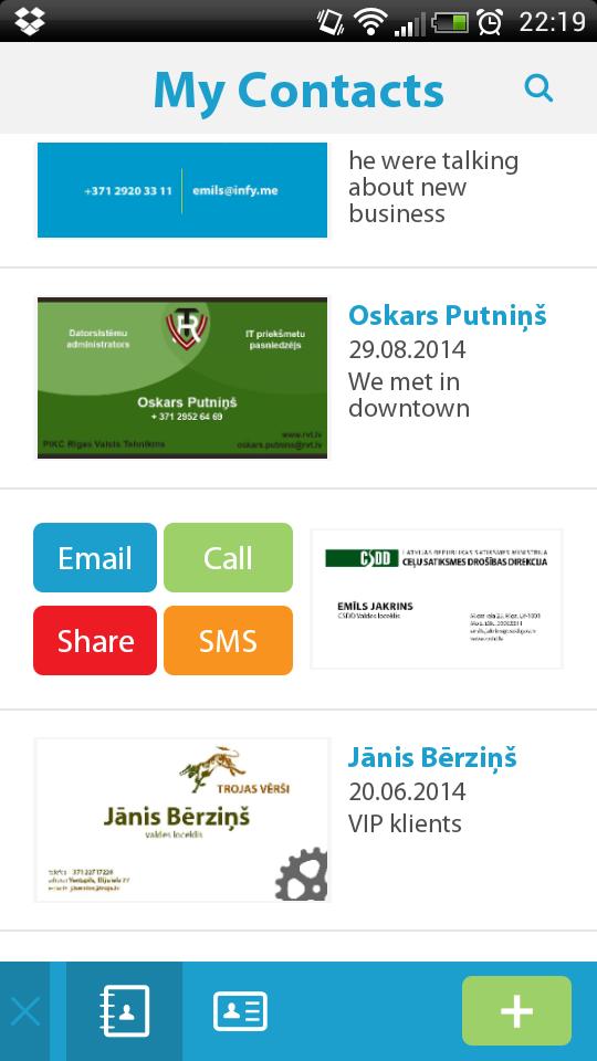 Esta aplicación proporciona no solo para mantener sus tarjetas de visita en la nube, sino para compartirlas fácilmente.