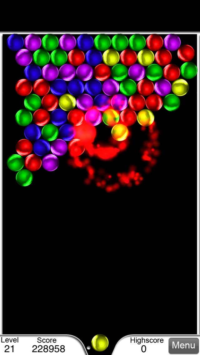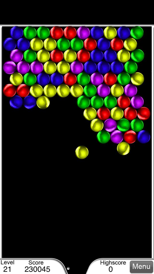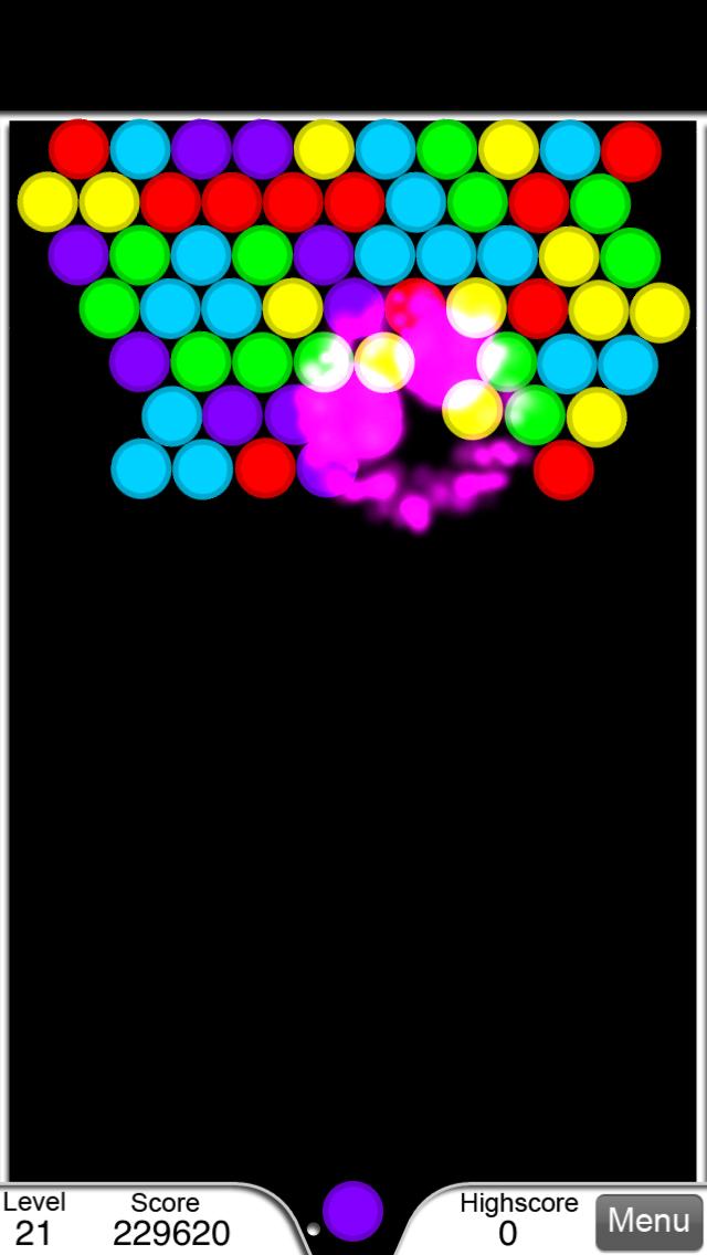 Appuyez sur l'écran pour faire de la bulle en bas de l'écran, tirez vers le point que vous appuyez. Plus il y a de bulles de la même couleur que vous frappez, plus vous obtenez de points. Si vous n'arrivez pas à frapper deux bulles ou plus de la même couleur, cela compte comme une faute. Après un certain nombre de défauts, une nouvelle rangée de bulles apparaîtra. Le nombre restant de défauts sera affiché sous forme de petits points blancs en bas de l'écran. Si vous parvenez à supprimer toutes les bulles, vous recevrez un score bonus et atteignez le niveau supérieur. Le jeu se termine si une bulle atteint la ligne d'information blanche en bas (mais vous pouvez réessayer le niveau à moins que vous ne réessayez que vous assayez "jamais").