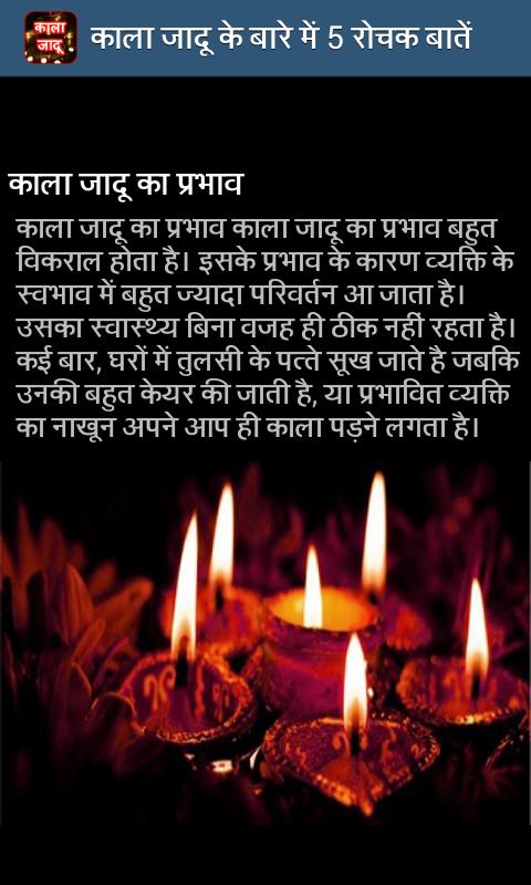 Cette application comprend les astuces, les conseils, le totke et le ton de la magie noire ou du kala jadoo. Beaucoup de prophète (Bhuva) essaient la magie noire sur les gens pour obtenir son résultat souhaitable. Le guide propose le tantra, le mantra et le upay de Vashikaran, Hypnotisme, Palstry et Samudrik Shashtra. La magie noire a une riche histoire dans la vie humaine et les gens anciens connaissent la sécrétion de Kali Kitab , mais maintenant peu de gens le savent.