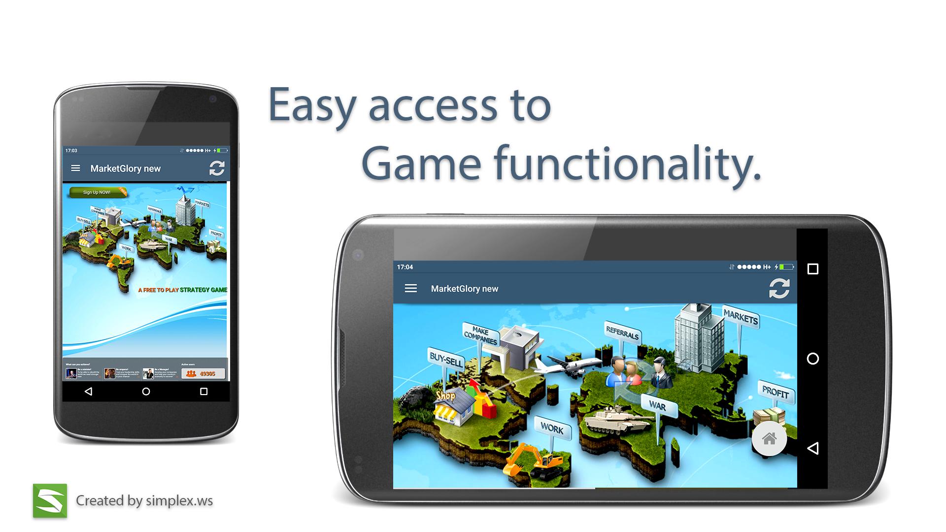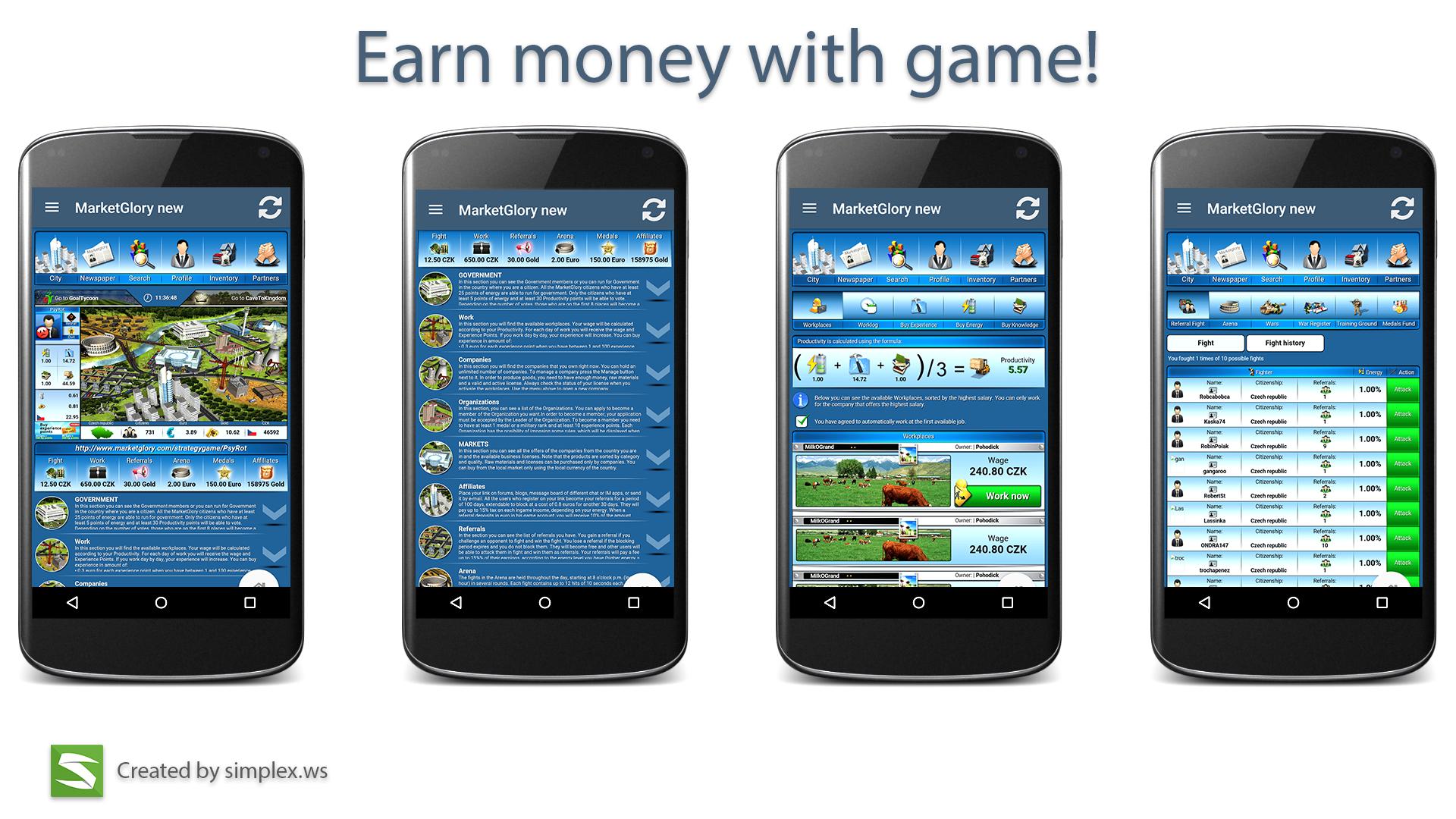 MarketGlory est un jeu de navigateur en ligne de masse dans lequel tout le currec virtuel peut être échangé en argent réel. Il s'agit d'un simulateur économique, politique, social et militaire où vous pouvez utiliser votre devise locale à votre avantage. Chaque acteur de la communauté MarketGlory a la possibilité de: travailler, installer des entreprises, se diriger vers le gouvernement, recommander des références, obtenir des rangs militaires et construire sa propre organisation.