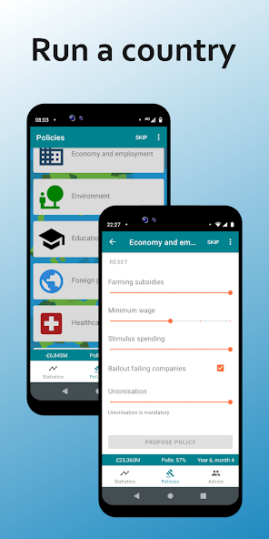 • Politiques: définir et mettre en œuvre des politiques dans des domaines comme l'éducation, la santé et le bien-être. Chaque décision a des conséquences d'une grande portée, démontrant les complexités d'un véritable jeu politique.