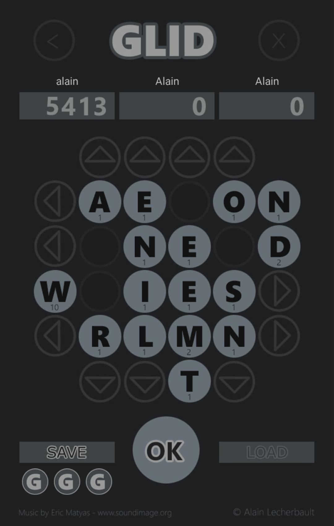 16 letters appear at the start of the game in a block of 4 x 4 letters. No horizontal or vertical word still exists in this initial block. It's up to you to create. To do this, you need to move the horizontal or vertical lines by clicking on the arrow keys appearing at each end. The whole line moves from box to box, including spaces later left empty. When you want to validate one or more words created, you need to click on the OK button on the game. Glid then scores all the horizontal and vertical lines of the playground and makes all the words that its dictionary recognizes, adding to the score the points acquired during this maneuver.