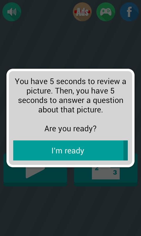 Anda memiliki 5 detik untuk melihat gambar. Kemudian, Anda memiliki lebih banyak 5 detik untuk menjawab pertanyaan yang terkait dengan gambar yang Anda lihat sebelumnya.