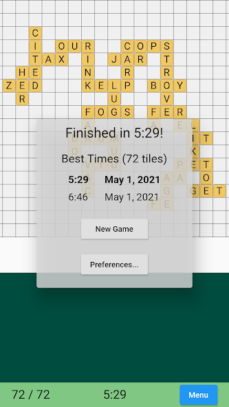Permainan kata di mana Anda menempatkan huruf untuk membuat kata -kata yang berpotongan secepat mungkin. Cobalah untuk mengalahkan waktu terbaik Anda, sambil berlatih kosakata dan anagram. Sumber gratis dan terbuka tanpa iklan.