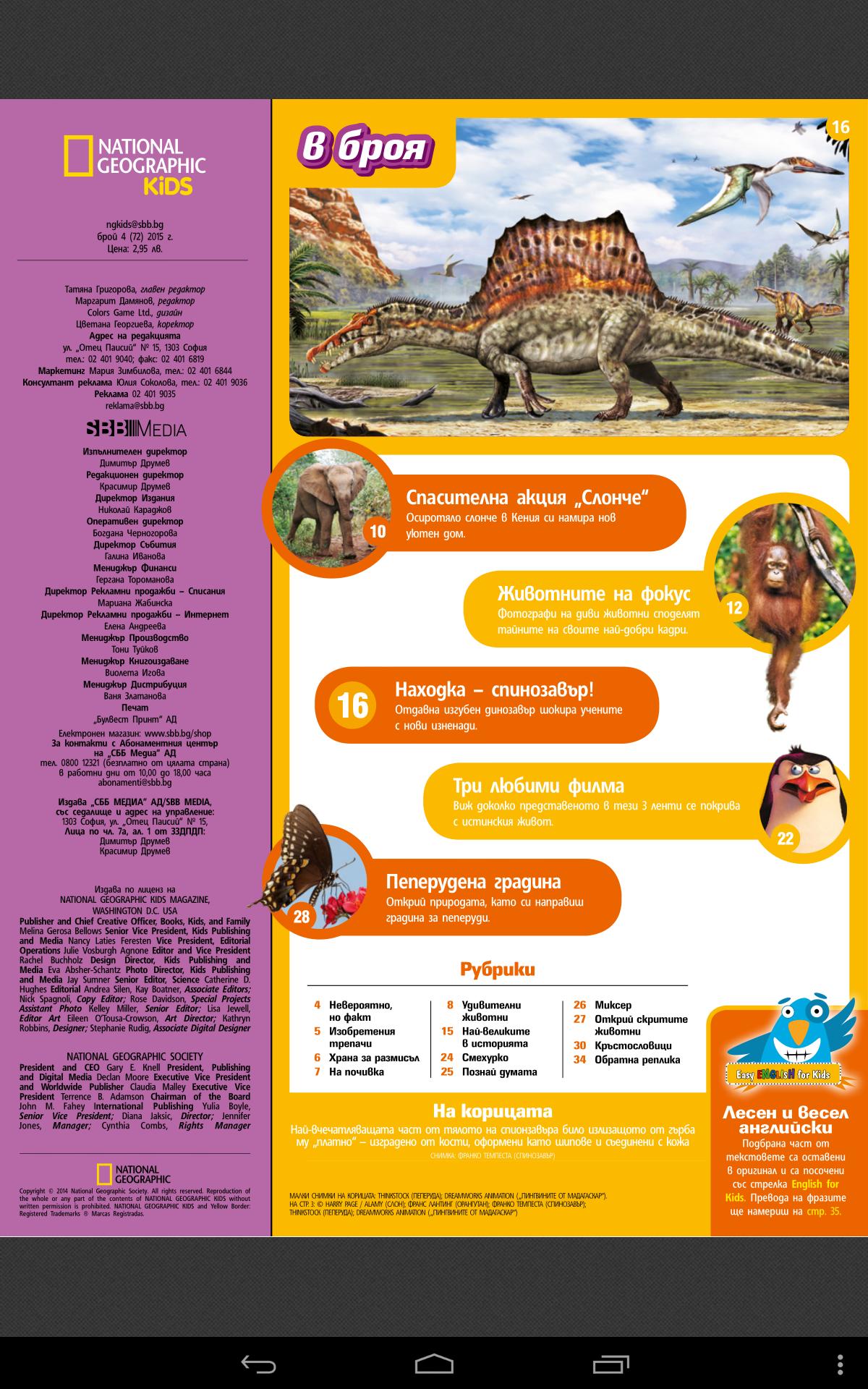 Selain fakta -fakta aneh yang sangat diilustrasikan dan bahan -bahan yang menarik, NG Kids Bulgaria memberi pembaca kecil kemampuan untuk berlatih bahasa Inggris. Setiap masalah berisi bagian Inggris untuk Anak -anak, di mana beberapa materi ditempatkan dalam aslinya dalam bahasa Inggris. "