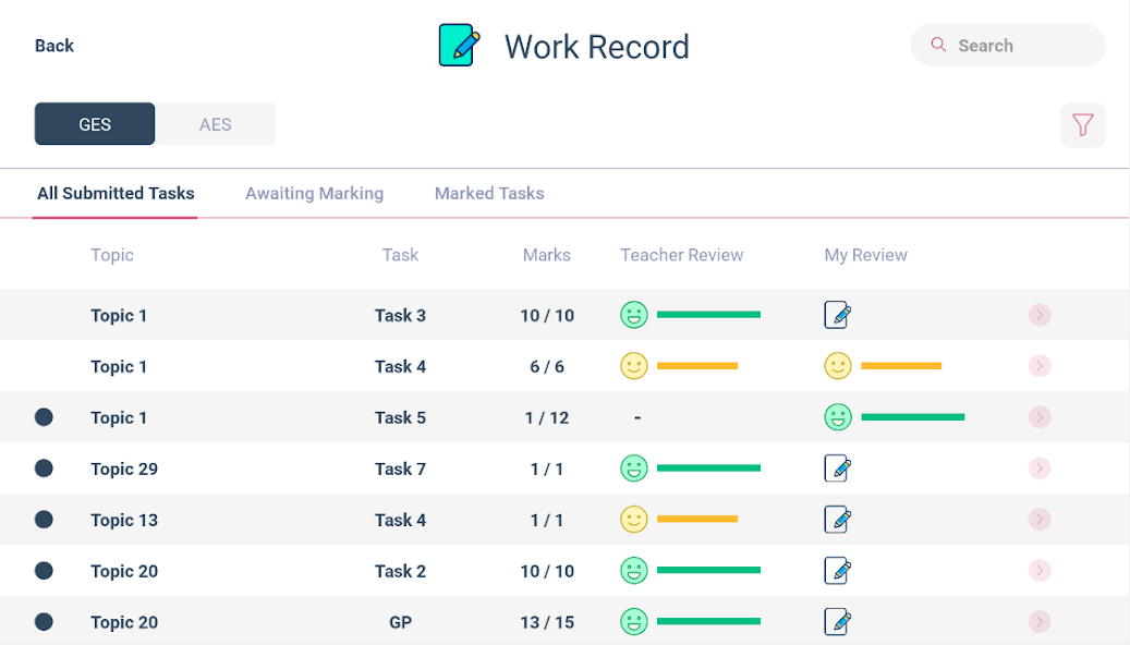 Work Record: Students can see the progress they have made on the courses, how many topics / tasks they have completed, how many topics / tasks are remaining. They can submit their own personal review of the tasks they have submitted and view the teacher’s comments and marks for tasks marked by a teacher.
