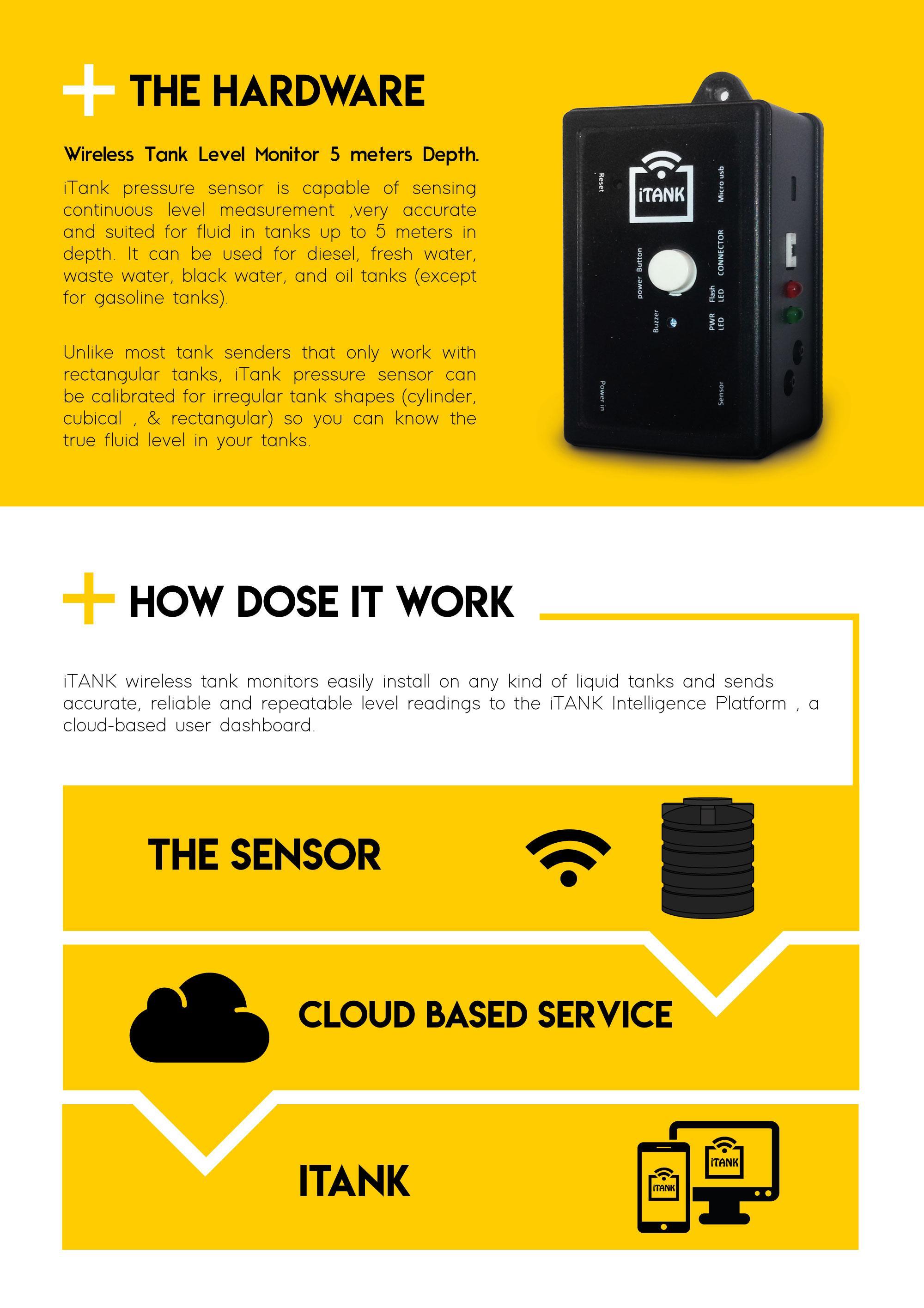 iTank is a wireless tank monitoring system that provides a "real time" level information of your liquid tank.