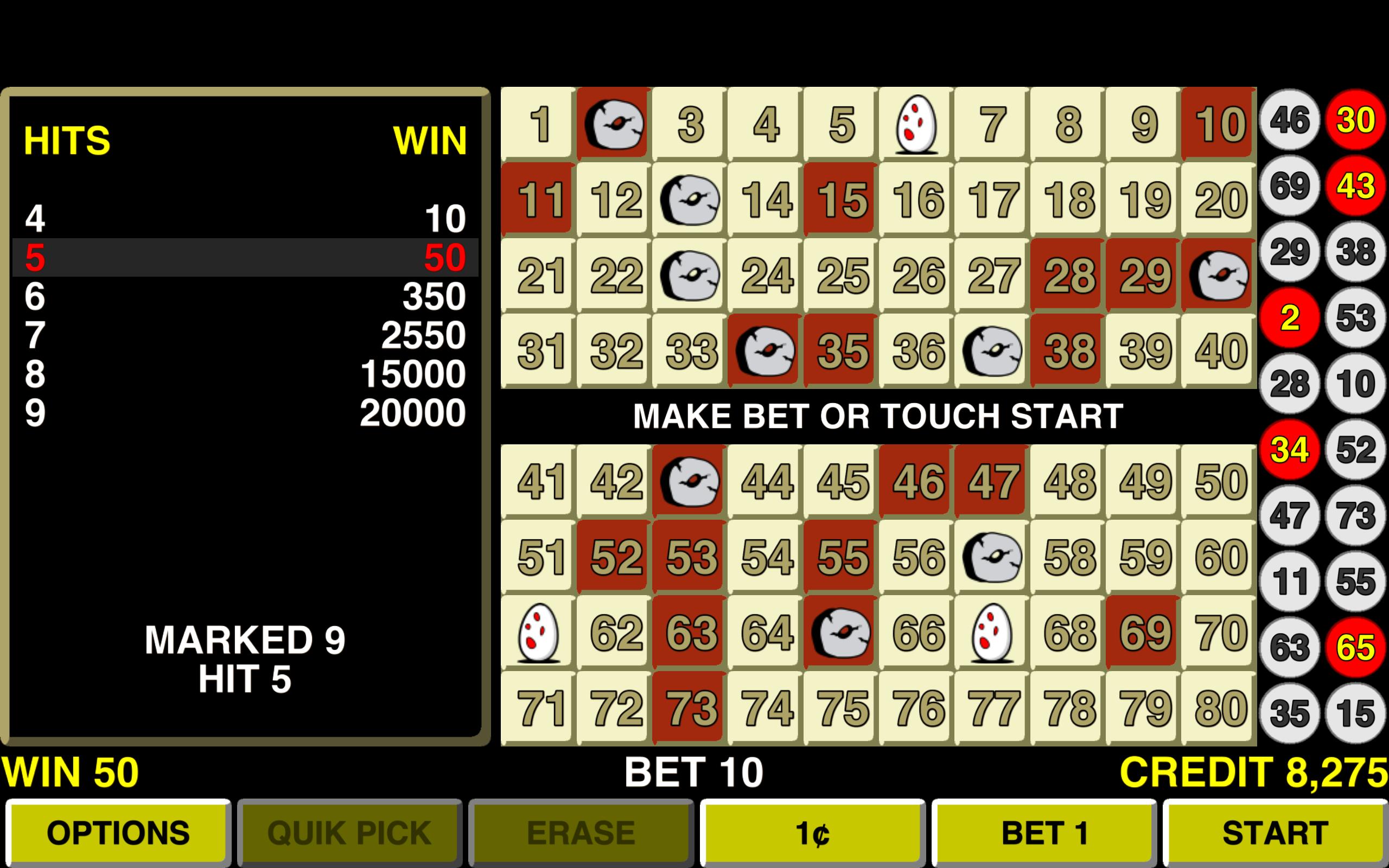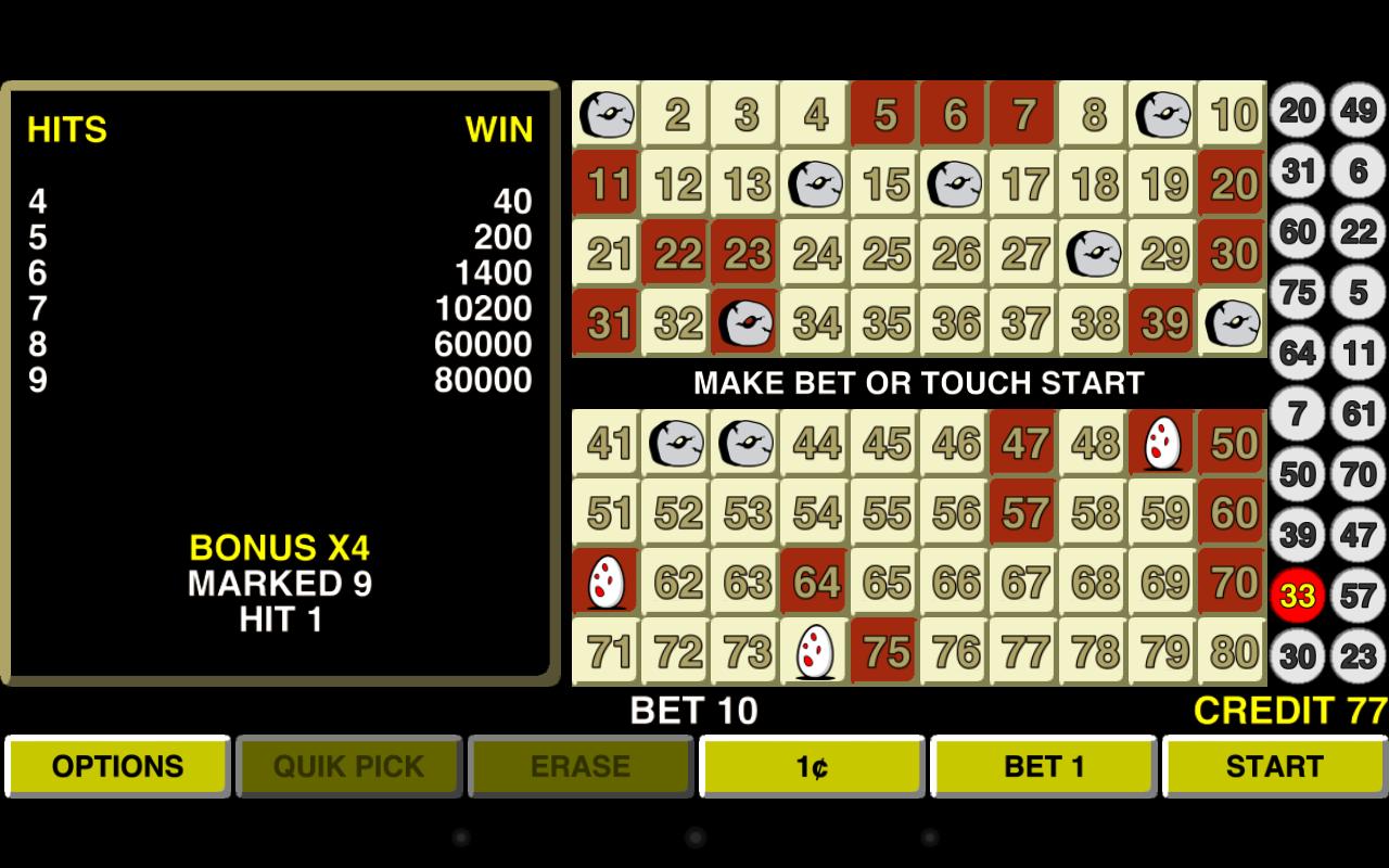 You just cant beat a classic game like Keno Eggs. So much fun! So much love. Now you can play the classic game of Keno Eggs at home, or on the go. Hit 2 EGGS = 4x WIN, Hit 3 EGGS = 10x WIN!