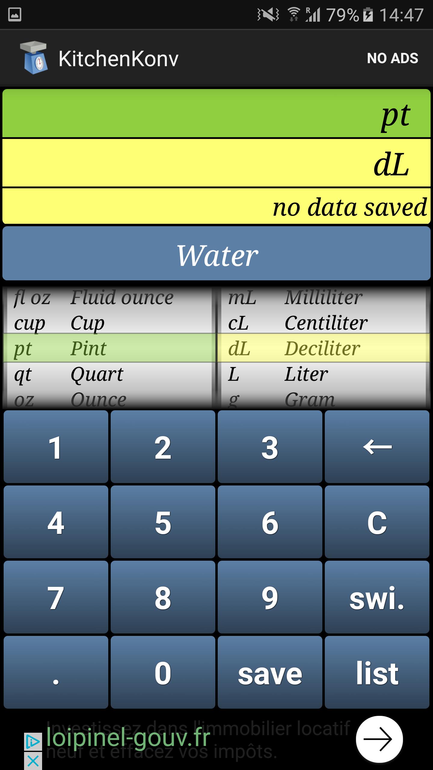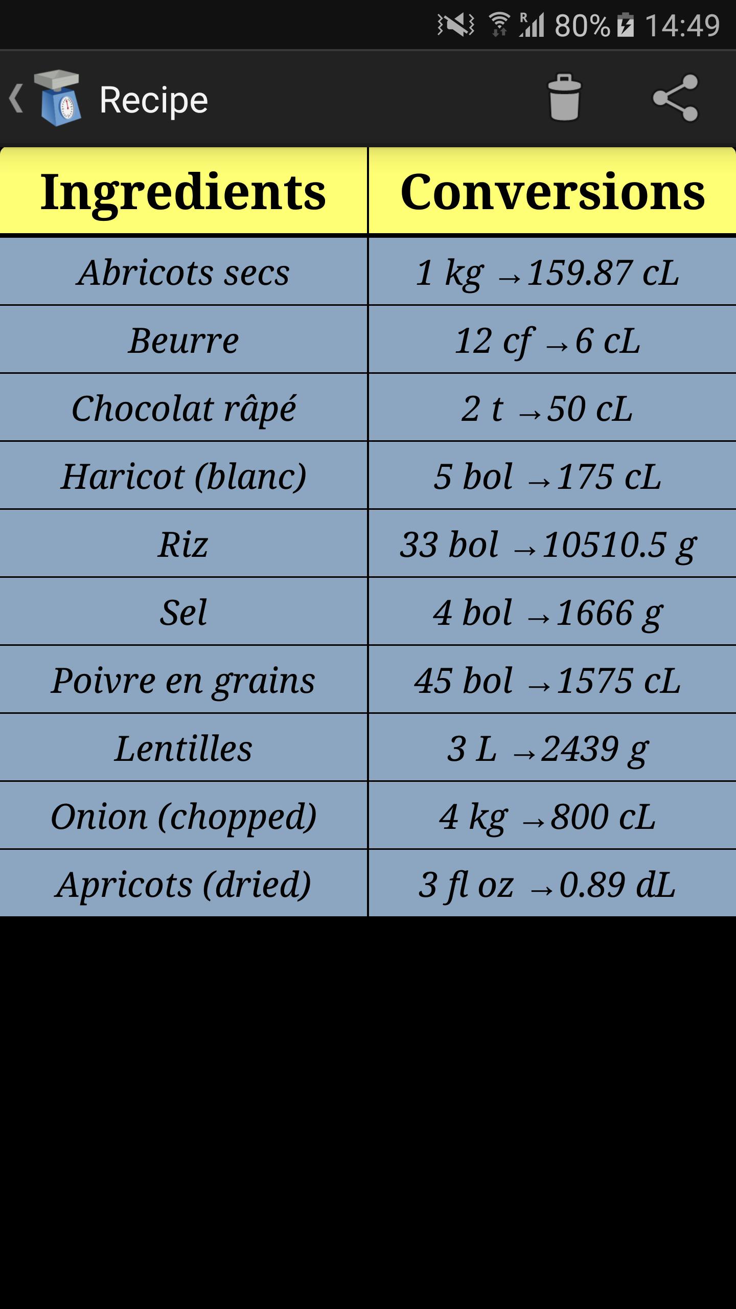 Converter volume to weight and weight to volume with an ingredient