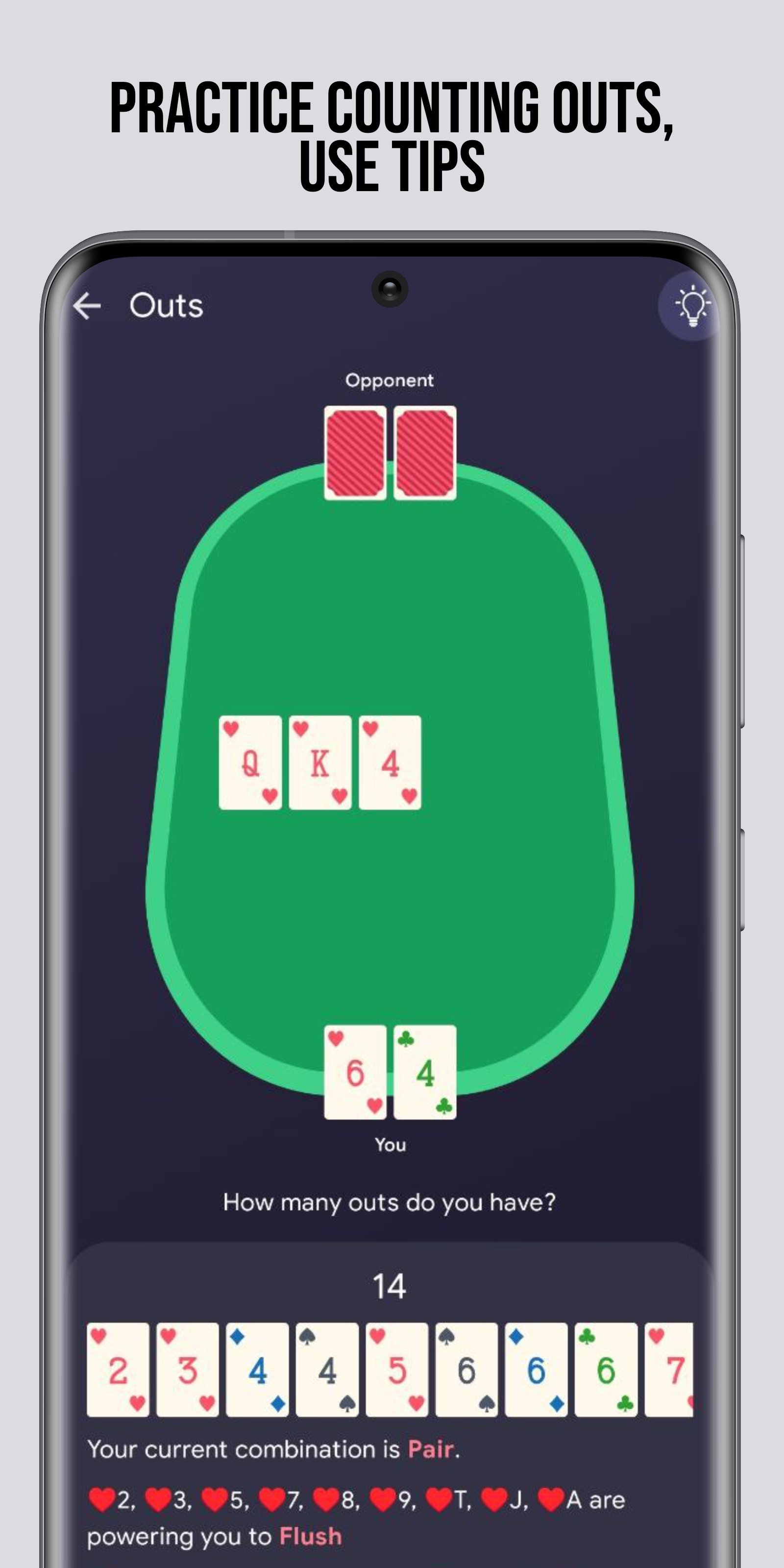 이를 통해 포커의 기본을 익히고, 특별히 고안된 훈련으로 게임을 개선하고, 진행 상황을 추적할 수 있습니다. 우리는 최신 기술을 사용하여 훈련 이벤트를 최대한 현실에 가깝게 만듭니다. 귀하의 피드백과 응용 프로그램 개발에 전문적인 플레이어의 직접적인 참여를 고려하면 오류를 최소화하고 더 유용하게 사용할 수 있습니다.