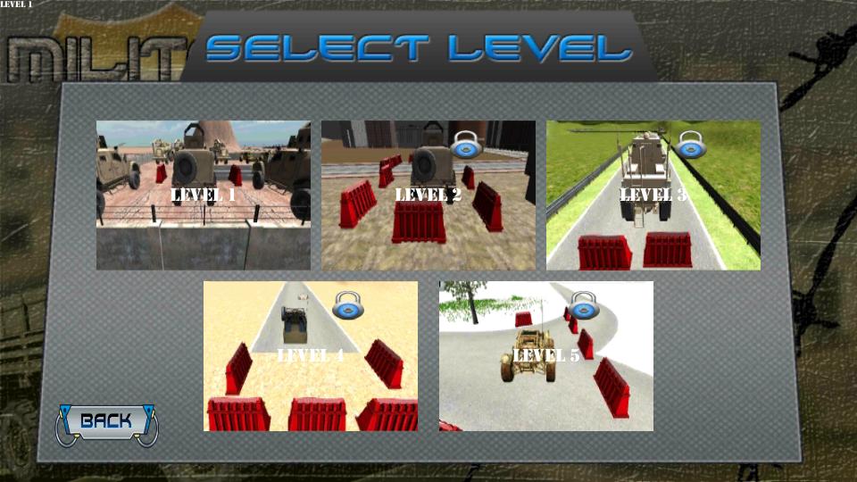 5 개의 다른 수준의 게임이 있으며 각 레벨은 군대 차량을 주차하기가 어렵습니다.