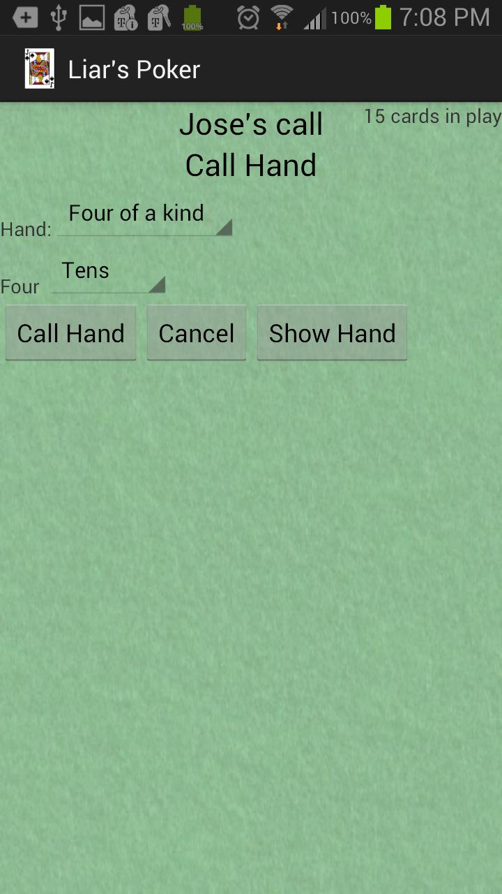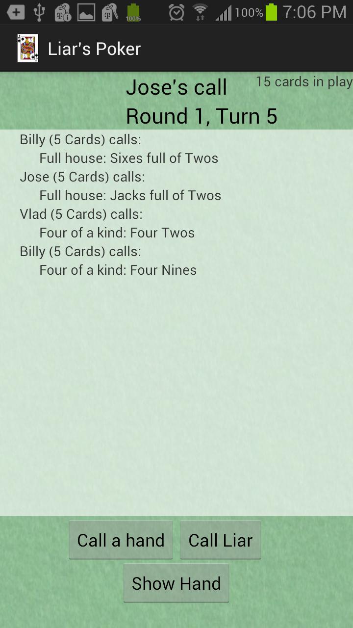At the beginning of each round, players are dealt a hand of cards. Any card that is dealt out is considered in play and can be used to form the poker hands called. When liar is called, all cards are revealed, and if the hand called exists in the pool of cards, the player that called liar loses a card the next round. The opposite is true if the hand does not exist in the card pool, i.e. the player who called the hand loses a card when cards are dealt again. This continues until there is only one person with cards in his hand, and that player is declared the winner.
