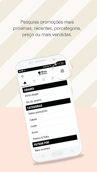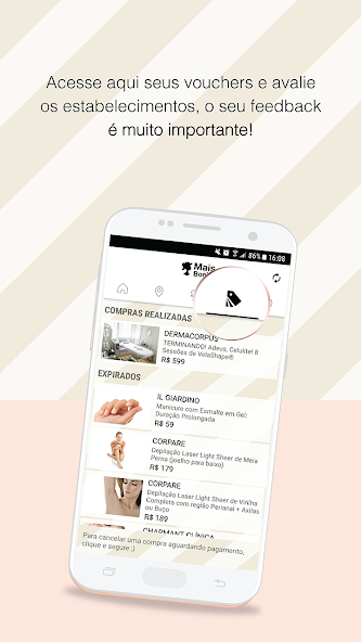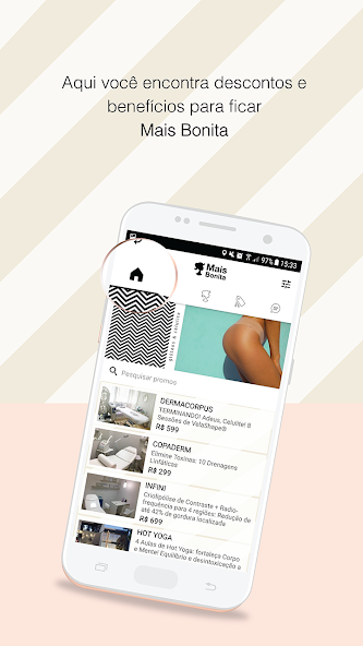 Most Beautiful for Less, first beauty-segmented discount app. There are more than 500 discounts and benefits in clinics, salons, esthetics and gyms in Rio de Janeiro, São Paulo, Porto Alegre and Canoas. Prices valid only for purchase by the app for a limited time and installment up to 6 x without interest. Find next services, see customer reviews, trace routes and get new services and treatments for Body, Face, Hair, Fitness & Diet.