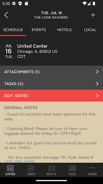 The app is designed to provide quick access to the critical information for each day. Data is stored locally for later offline access so you can avoid costly international roaming data fees. The color scheme is all black - the official color of touring bands and road cases. It can be none more black!